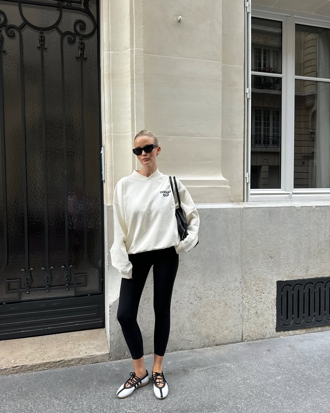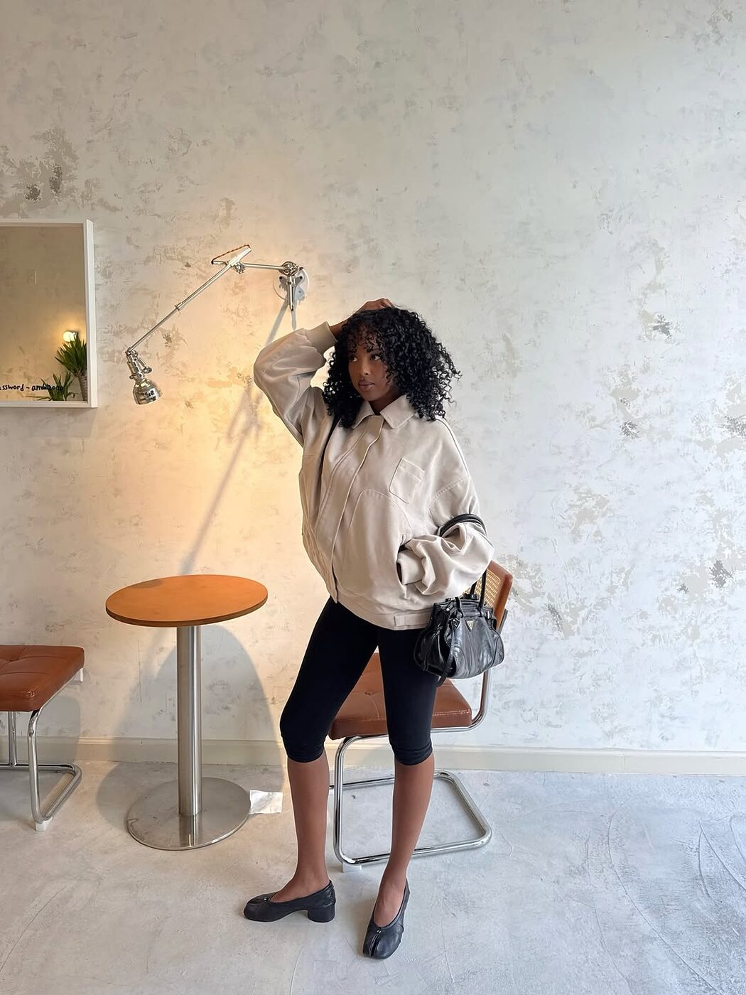레깅스에 볼드한 스니커즈 대신 밑창이 얇은 플랫 슈즈를 신하면 발끝의 실루엣이 가벼워져 다리가 한층 더 길어 보이고 전체 비율도 깔끔하게 정리됩니다. 특히 발목이 드러나는 길이의 레깅스와 만나면 그 효과가 더욱 또렷해지죠.