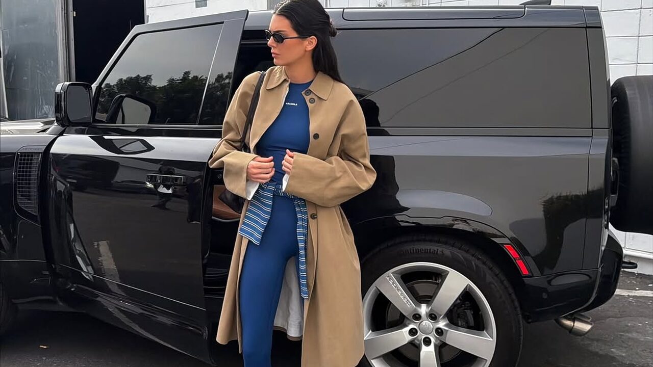 로열 블루 컬러의 아다놀라 톱과 레깅스에 심플한 트렌치 코트를 매치한 켄달 제너. 허리에는 스트라이프 패턴의 톱을 둘러 커버업 효과를 주면서도 포인트를 더했습니다. 긴 아우터에 발목까지 타이트하게 떨어지는 레깅스 조합이 자칫 답답해 보일 수 있지만, 발등이 드러나는 플랫 슈즈를 선택해 가볍게 풀어냈죠.