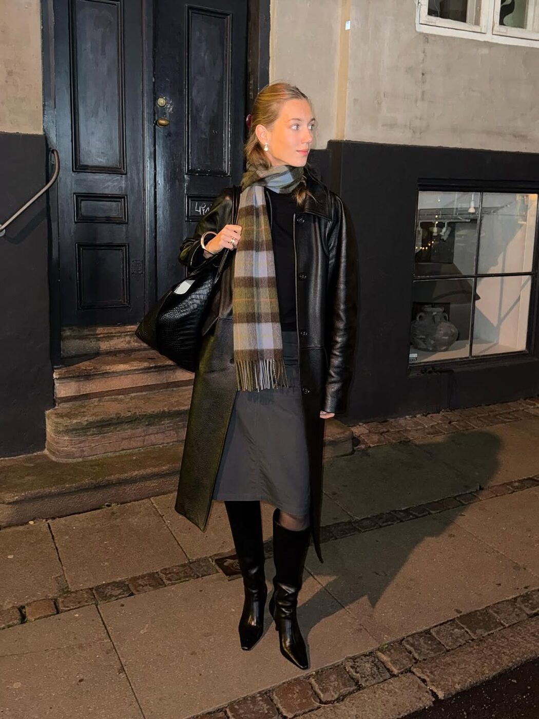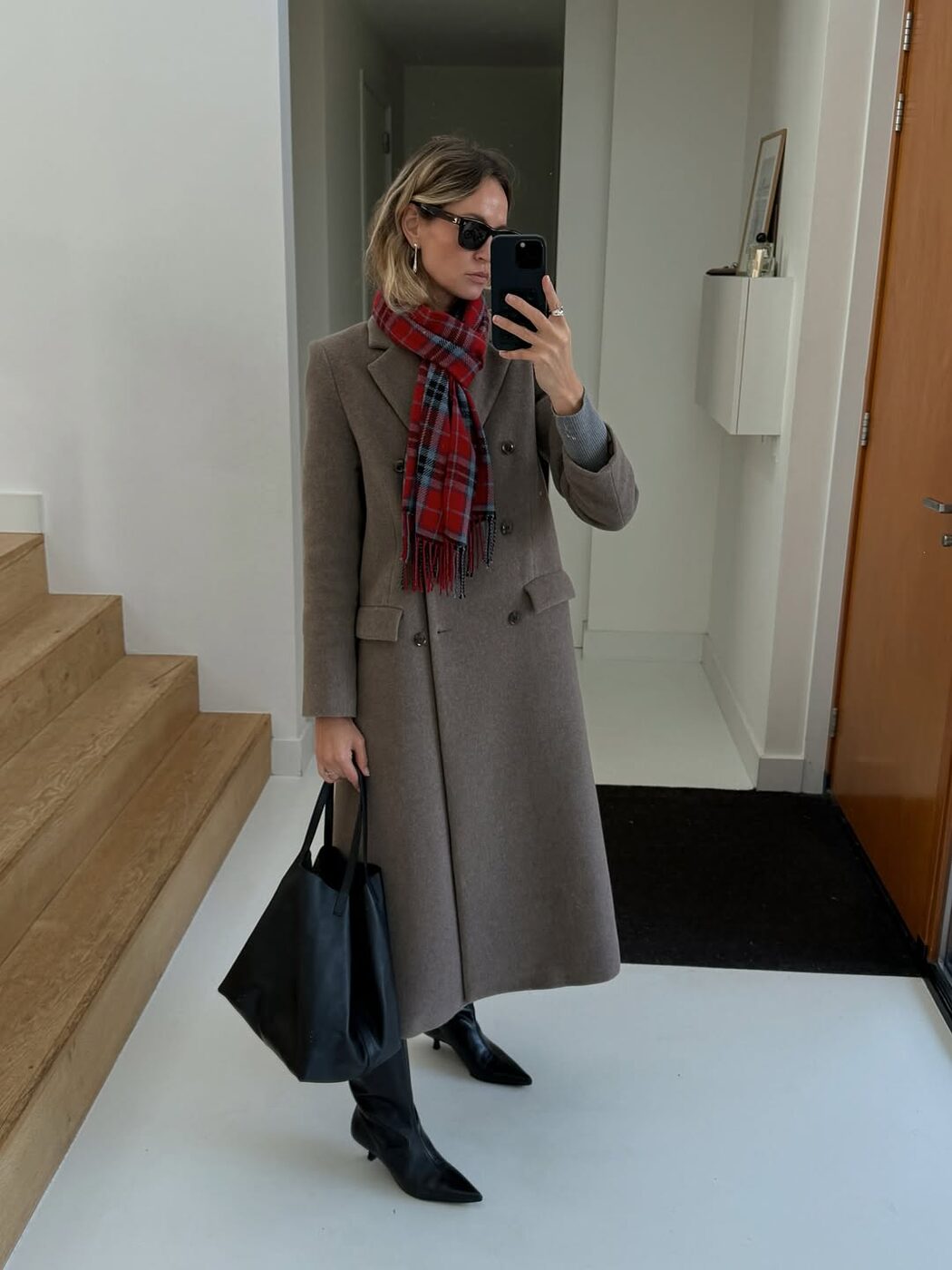 빨간색 글렌체크는 겨울의 상징적인 패턴 중 하나이기도 하죠. 밝은 컬러지만 더블 브레스트 코트처럼 포멀한 옷에 매치해도 의외로 잘 어울립니다. 오히려 겨울철 칙칙하고 무거운 출근룩에 포인트를 더할 수 있죠.