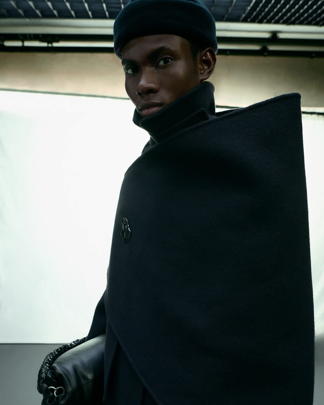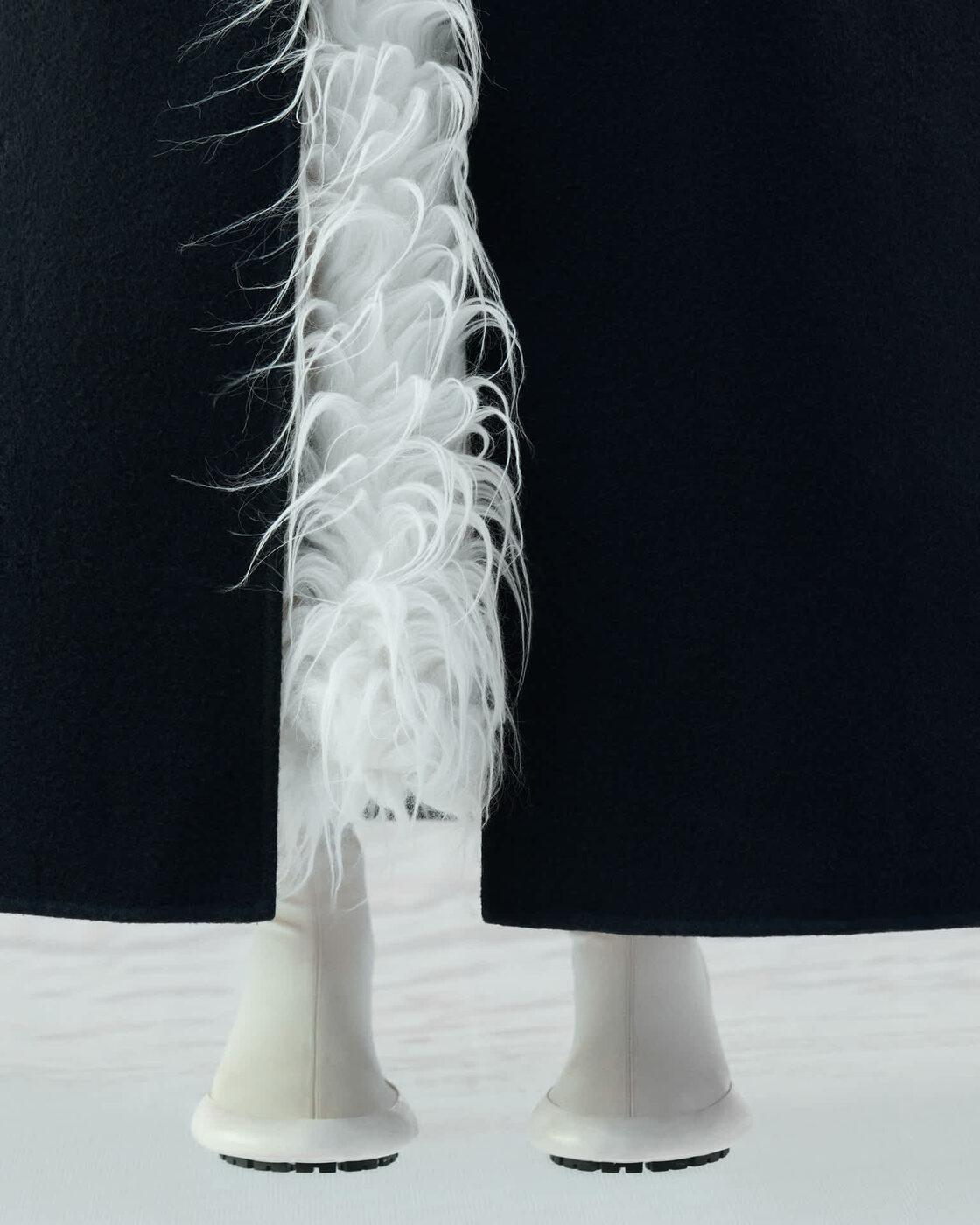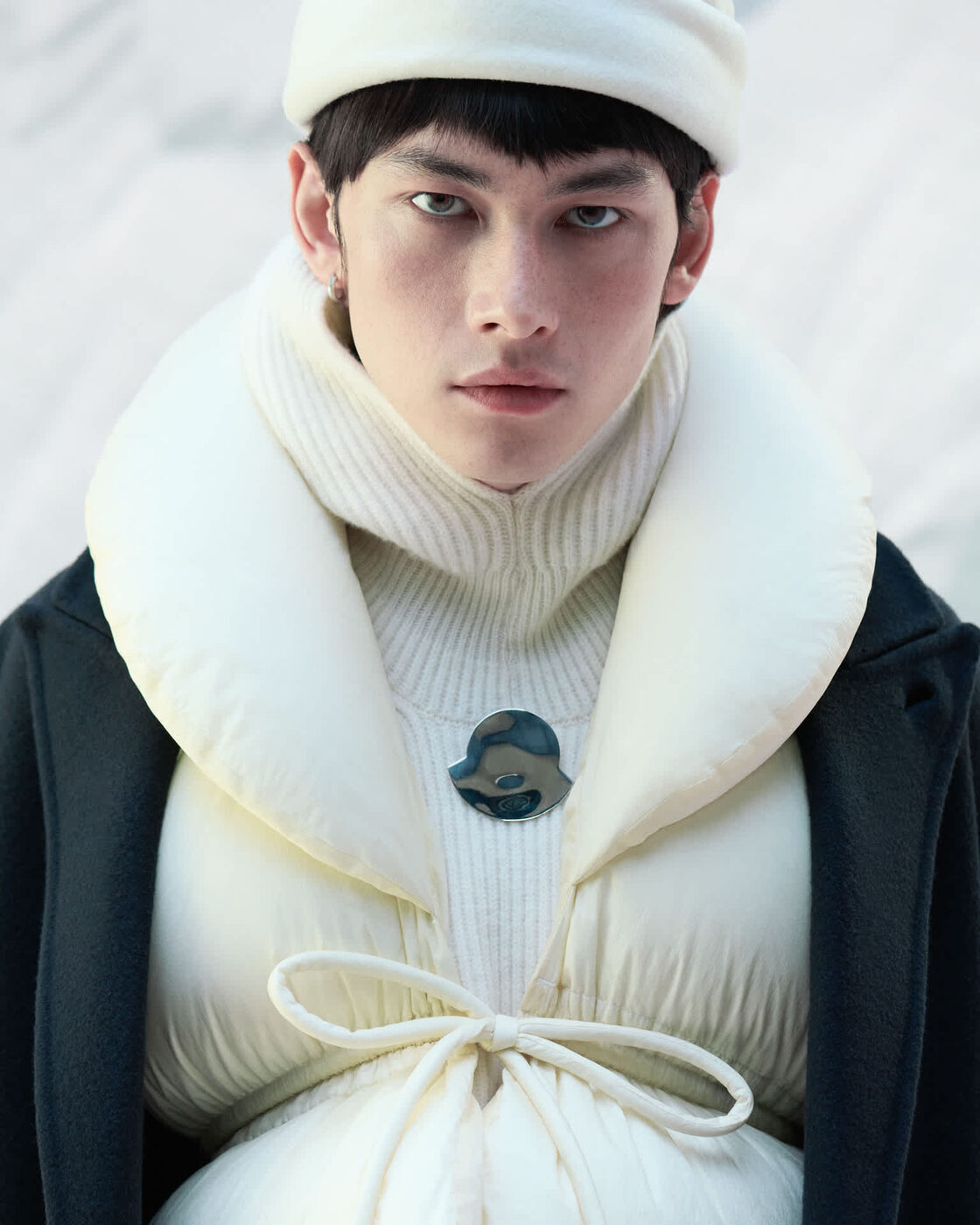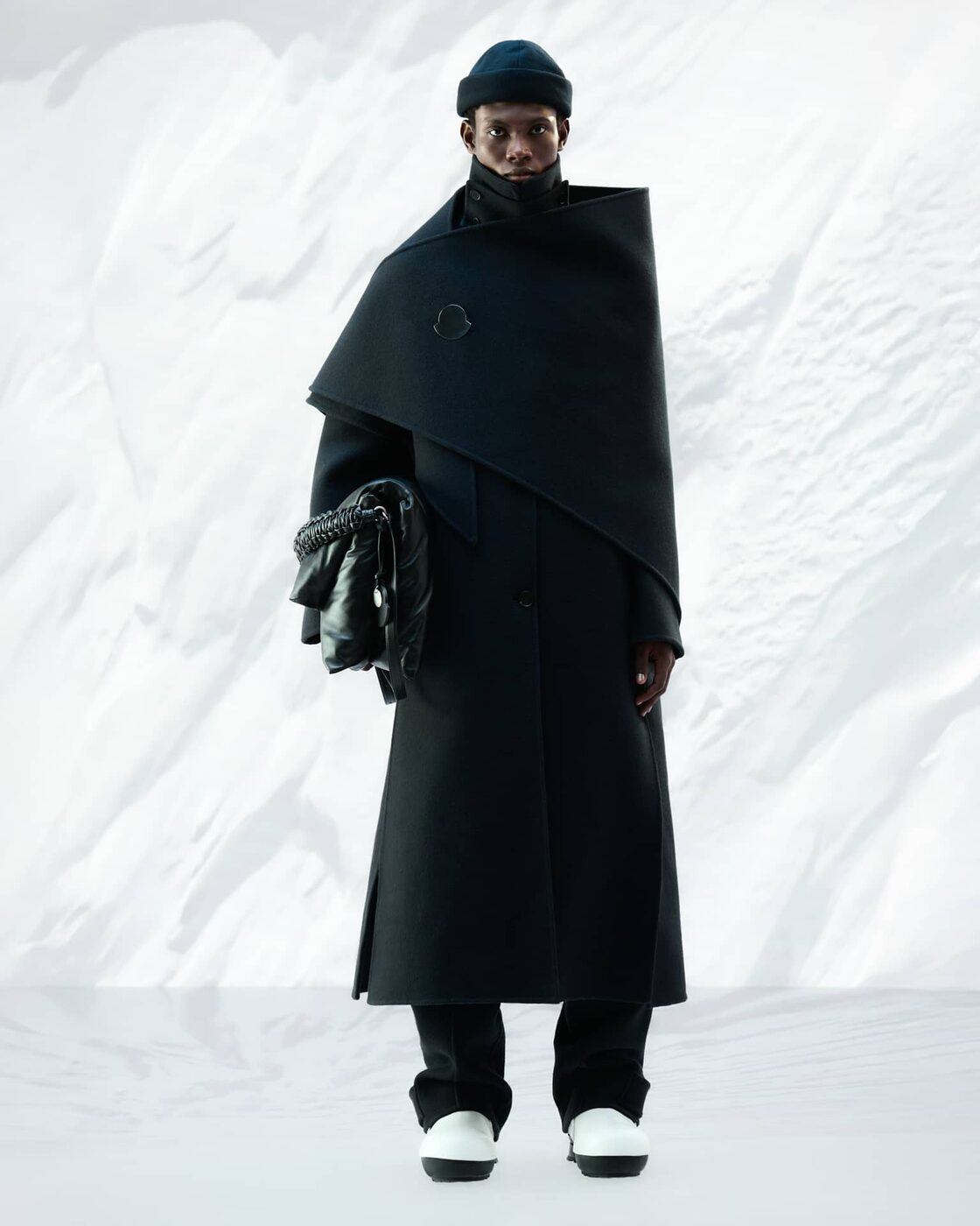 볼륨감 있는 레이어와 유려한 곡선은 이번 협업을 정의하는 핵심이다. 패디드 재킷과 카디건, 돔 실루엣의 스커트는 눈 덮인 지형의 부드러운 라인을 연상시키며, 실버 톤 핀 디테일은 곡선과 원형을 활용해 몽클레르 로고의 윤곽을 섬세하게 드러낸다. 소재 구성 역시 두 브랜드의 미학을 이어간다. 소프트 더블 울, 워싱 코튼 트윌, 움직임에 따라 자연스럽게 흐르는 롱헤어 울은 부드러운 질감과 구조적인 실루엣을 동시에 담아낸다. 풍성한 카디건과 코트는 몽클레르의 다운 충전 나일론과 레이어링되며 실용성과 우아함이 공존하는 룩을 만든다.