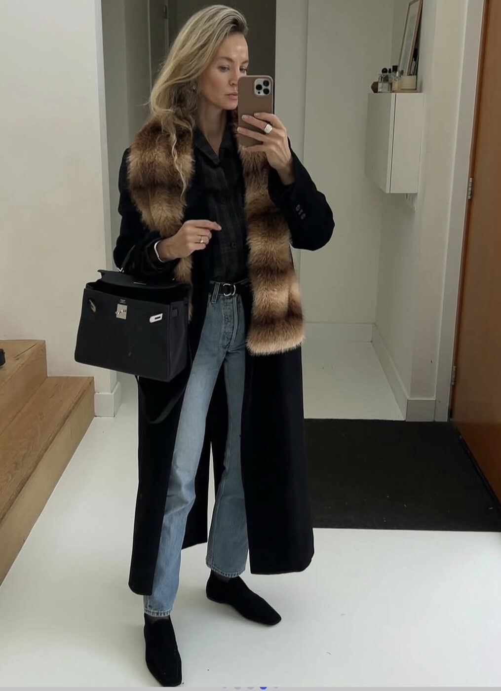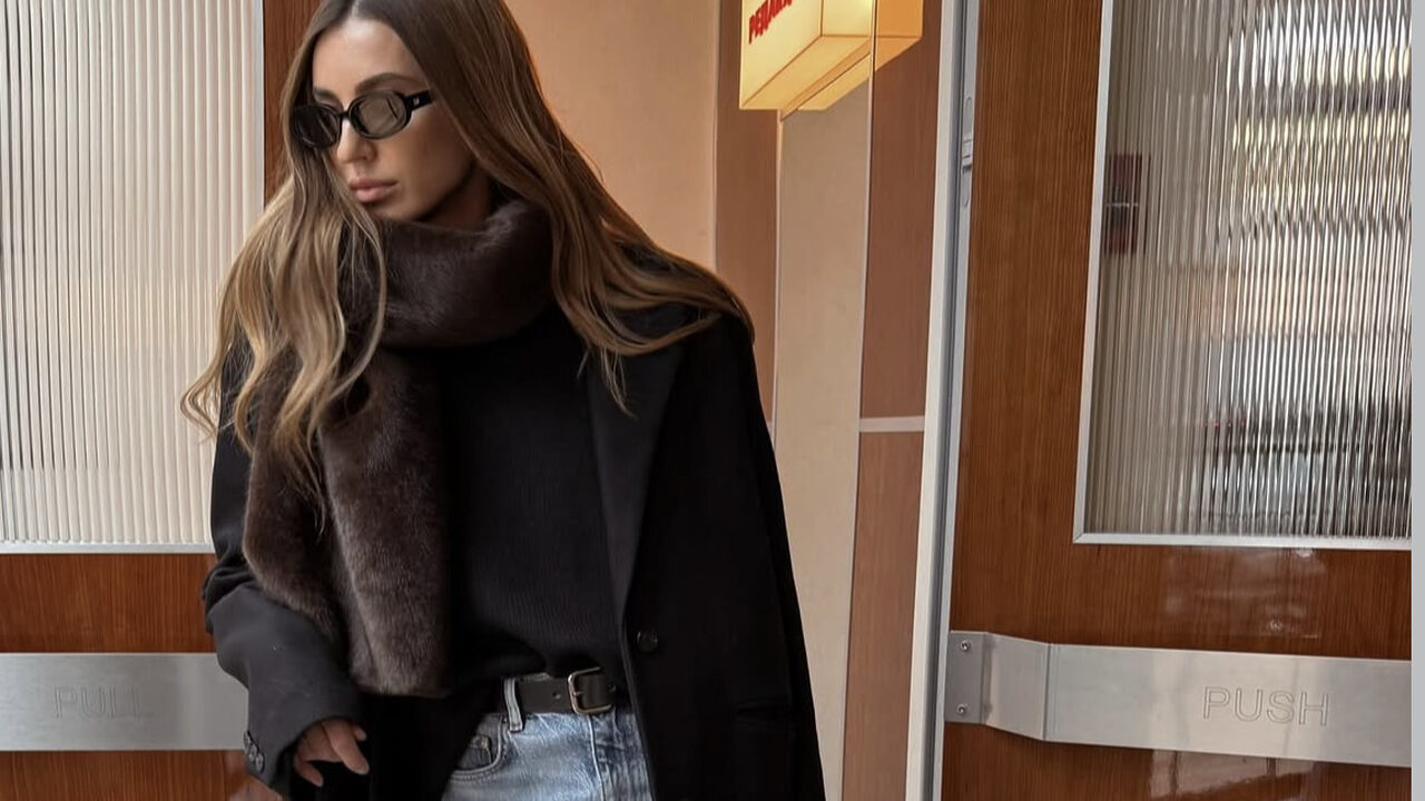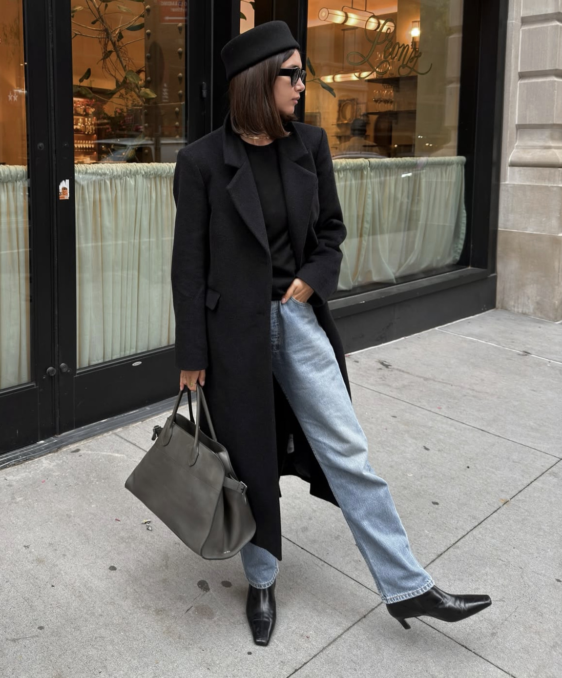 겨울에 입는 시가렛 진 스타일링의 가장 중요한 포인트는 바로 날씬한 실루엣의 청바지와 상반된 스타일의 오버핏 아우터를 입는 거예요. 길이가 길수록, 어깨가 클수록 다리는 더 길고 날씬해 보입니다. 어깨가 강조된 헤링본 소재의 브라운 롱 코트와 갈색 토트백이 자연스러우면서도 스타일리시한 조화를 이룹니다.