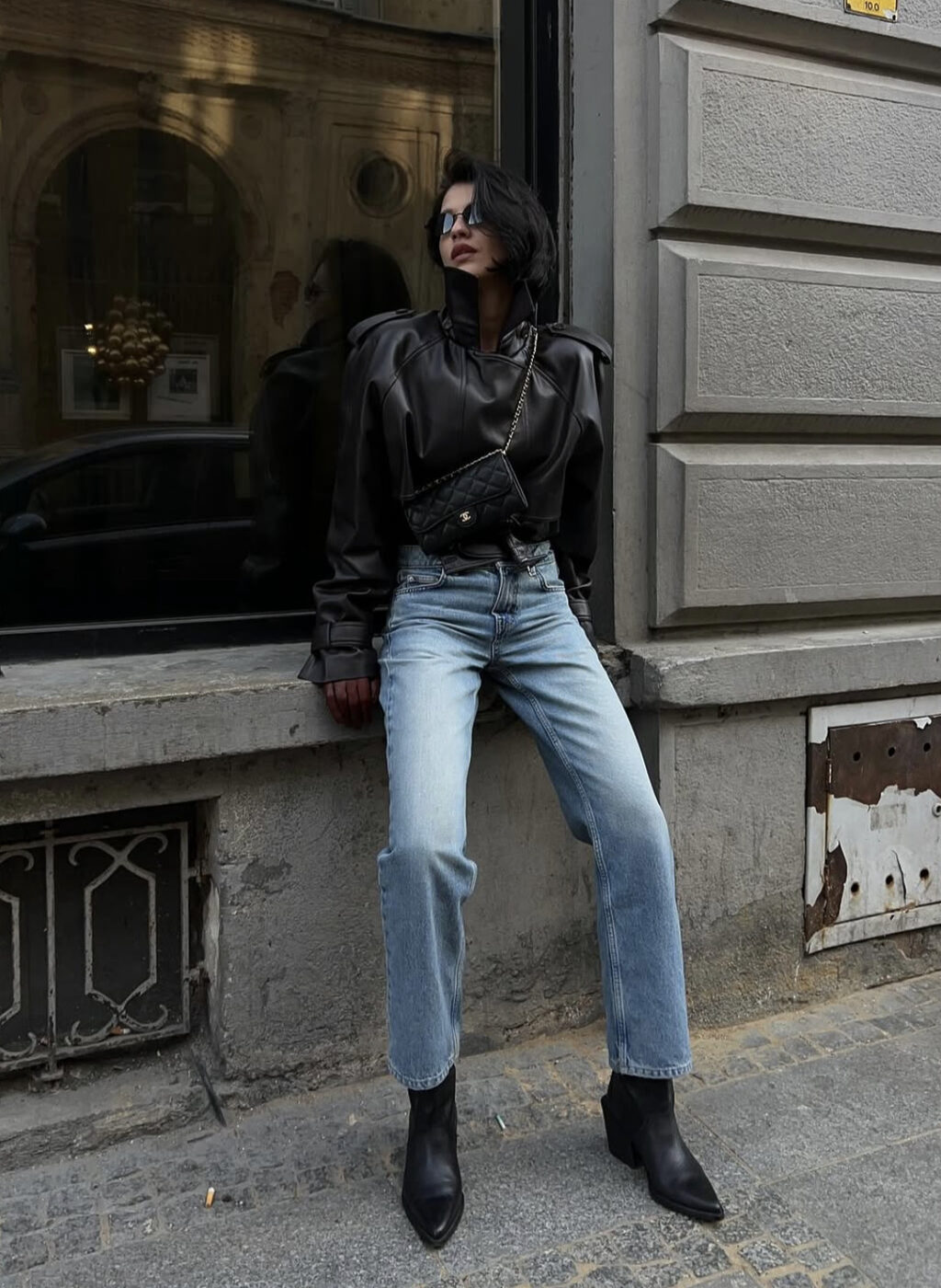 더욱 에지 있는 룩을 위해서 블랙 레더가 제격입니다. 어깨가 강조된 짧은 길이의 레더 보머 재킷에 빈티지한 시가렛 진을 입고 날렵한 라인이 돋보이는 웨지 힐 앵클 부츠를 신어 볼드한 포인트를 더했죠. 여기에 미니 체인백까지 더해진 레트로 무드가 돋보입니다.