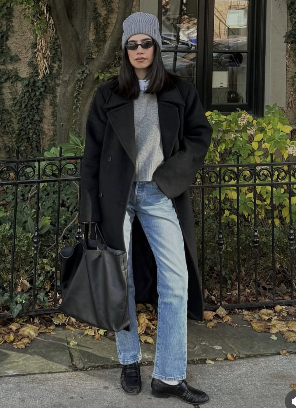 뭐니뭐니해도 이 늘씬한 라인의 청바지엔 롱 코트를 업어야 제 맛이 납니다. 아이템들은 기본 스타일을 고수할수록 더 세련된 이미지가 완성되요. 연한 청바지에 심플한 그레이 니트, 그리고 빅 칼라가 돋보이는 베이식한 블랙 롱 코트를 걸쳤죠. 흰 양말에 검정 로퍼까지 공식에 맞춰 신은 뒤, 커다란 그레이 비니와 선글라스로 꾸안꾸식 포인트를 주었습니다.