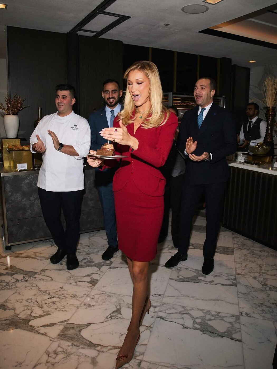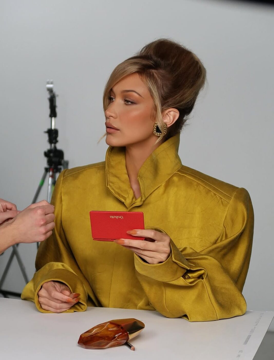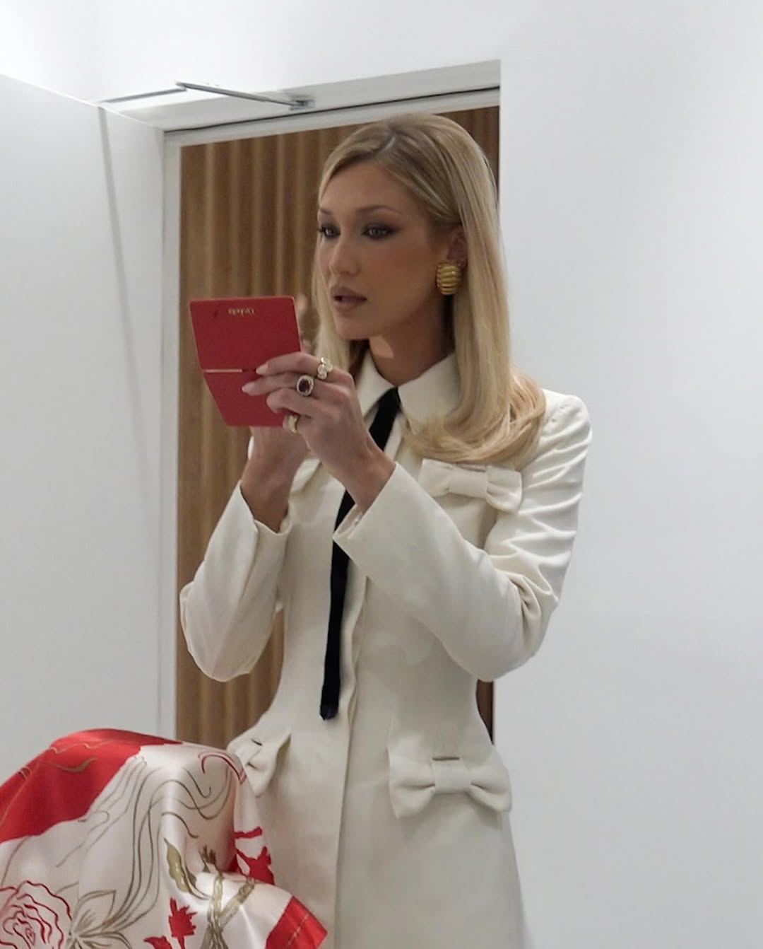 공식적인 브랜드 홍보 일정에 새빨간 슈트 셋업의 단정한 모습으로 등장한 벨라 하디드. 그녀가 선택한 룩은 존 갈리아노의 빈티지 피스입니다. 어깨와 허리에 드레이핑 디테일이 여럿 더해진 패블럼 형태의 유려한 실루엣으로 벨라의 슬림한 곡선을 아름답게 보여준 룩이었죠. 슈즈 또한 마놀로 블라닉의 빈티지 뮬 힐을 매치해 레트로한 레이디스 룩의 바이브를 맘껏 드러냈습니다. 마치 본래 자신의 옷이었던 듯 찰떡같이 소화하는 본체 모델의 면모 속 업무에 열중하는 우아한 비즈니스 우먼의 모습이었죠.