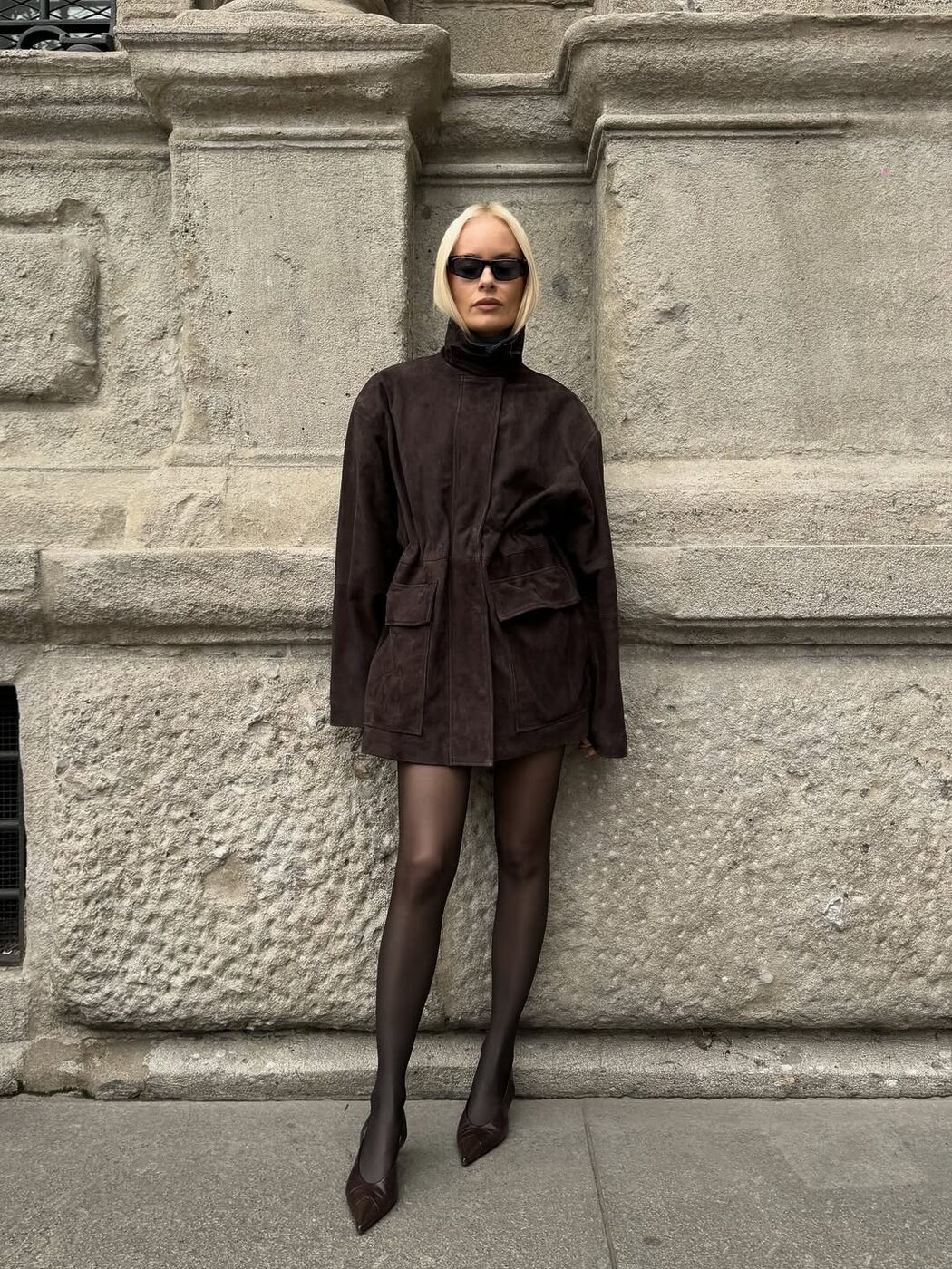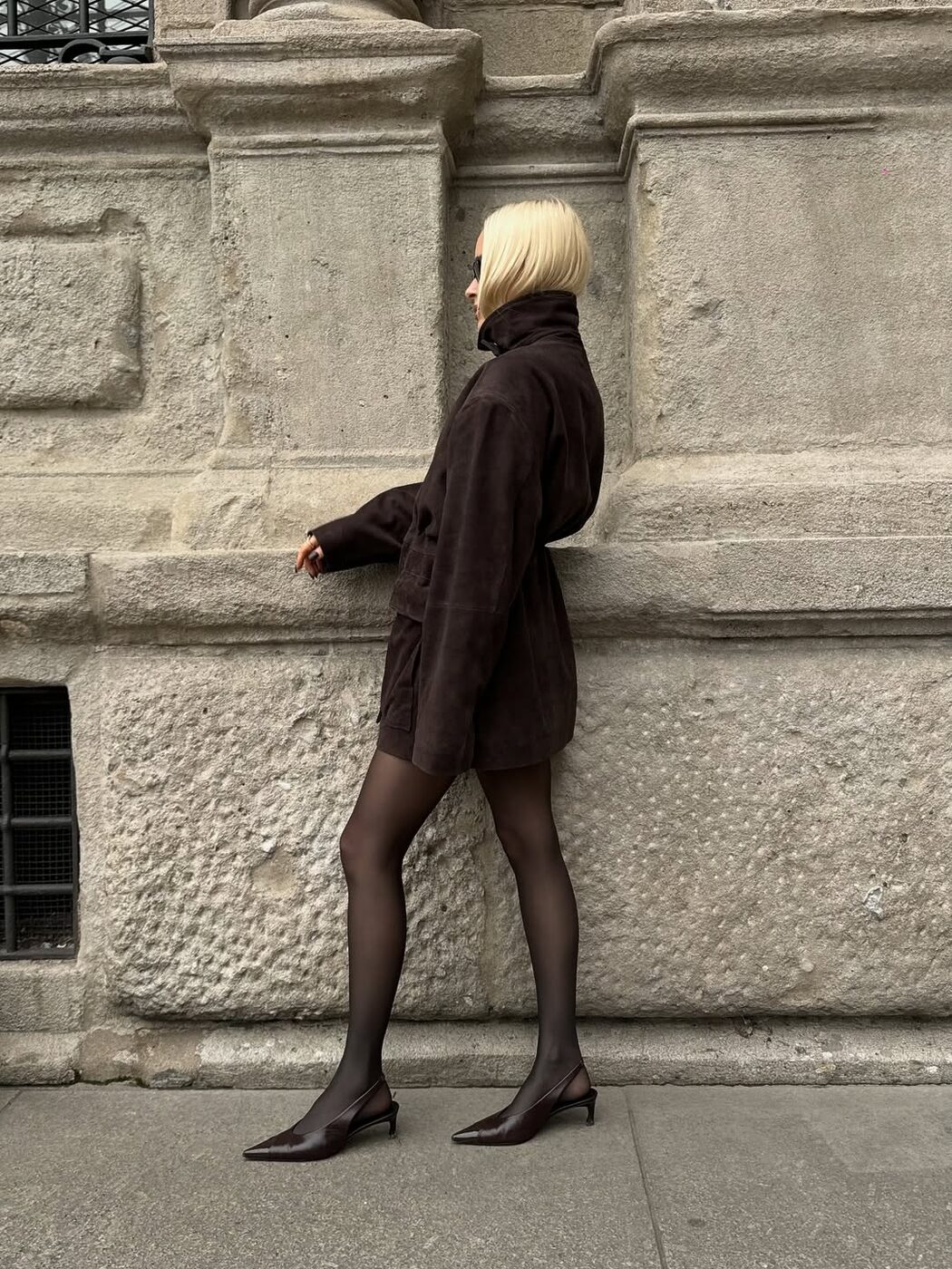 하이넥 디자인의 블랙 스웨이드 재킷에 은은하게 비치는 스타킹 그리고 블랙 슬링백 슈즈를 매치해 우아한 관능미를 연출해 보세요. 베이직한 아이템들의 조합이지만 하의 실종 스타일링이 더해지면 전혀 다른 분위기를 완성할 수 있습니다. 과하지 않으면서도 충분히 멋스러운 연말 룩이네요!