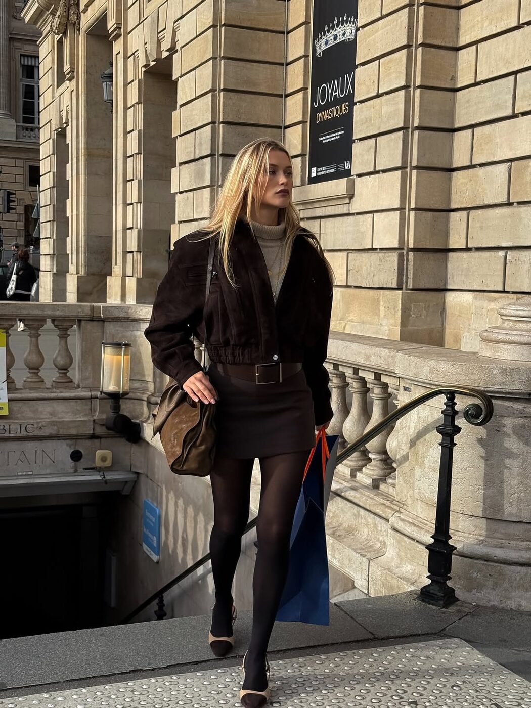 긴 아우터에 미니스커트 그리고 부츠를 함께 매치하는 조합은 겨울 스타일링을 대표하는 클래식한 공식 중 하나입니다. 퍼 트리밍이 더해진 개성 있는 아우터에 플리츠 미니스커트를 매치하고 부츠로 마무리해 빈티지하면서도 동시에 트렌디한 무드를 완성했습니다. 여기에 브라운 계열로 컬러 톤을 통일해 한층 깊이 있고 세련된 분위기를 강조한 점도 인상적!