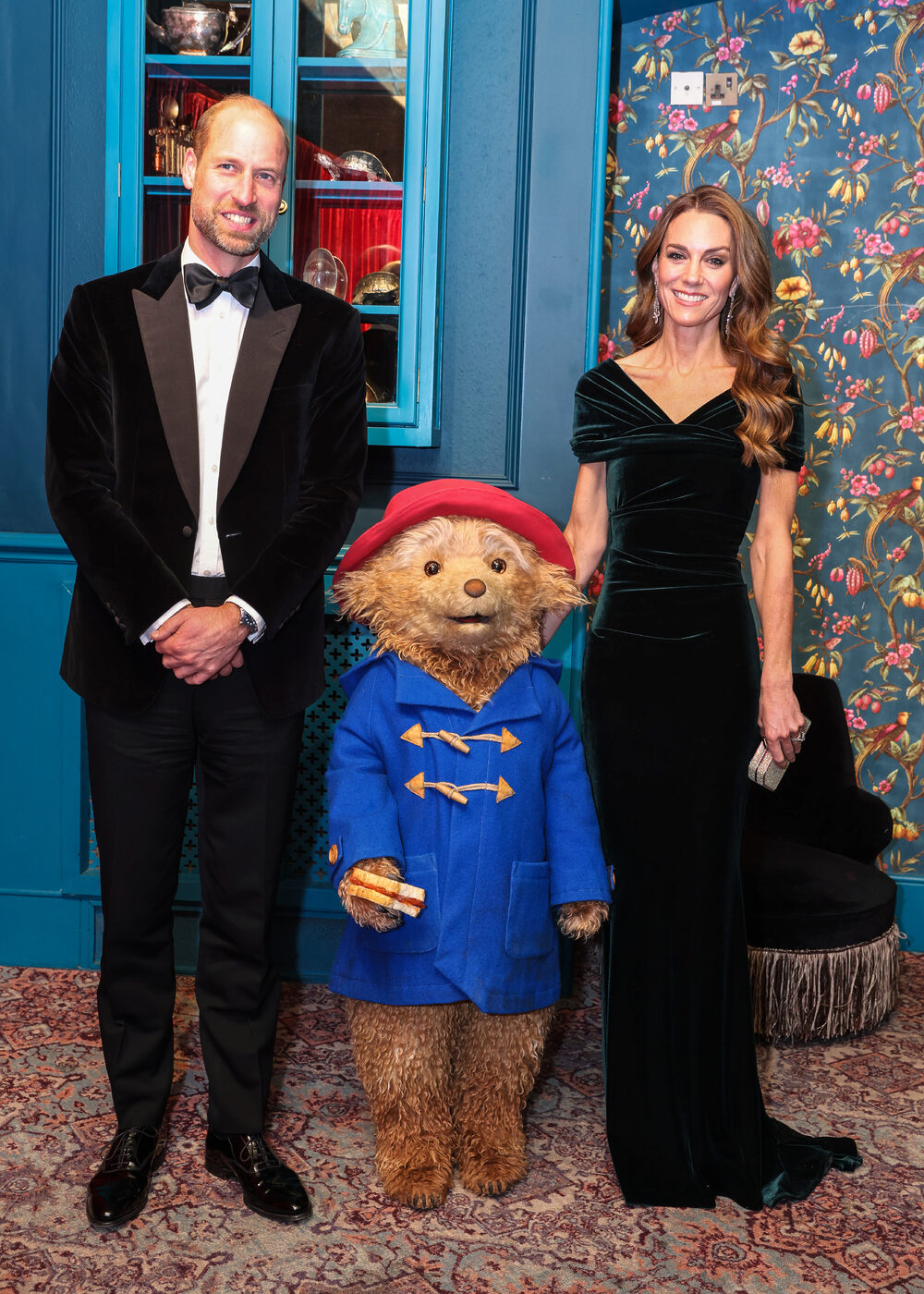 이보다 더 고급스러운 컬러가 있을까 싶어요. 어둠 속에서 은근히 광택을 드러내면 슬림한 라인을 고스란히 드러낸 롱 드레스를 입은 케이트 왕세자비. 삼각형의 네크라인에 어깨를 감싸는 슬리브 디자인의 클래식한 드레스는 자연스러운 주름 디테일이 여성스러움을 극대화했어요. 슈즈까지 같은 컬러의 펌프스로 맞춰 완벽한 옷차림을 선보였습니다.
