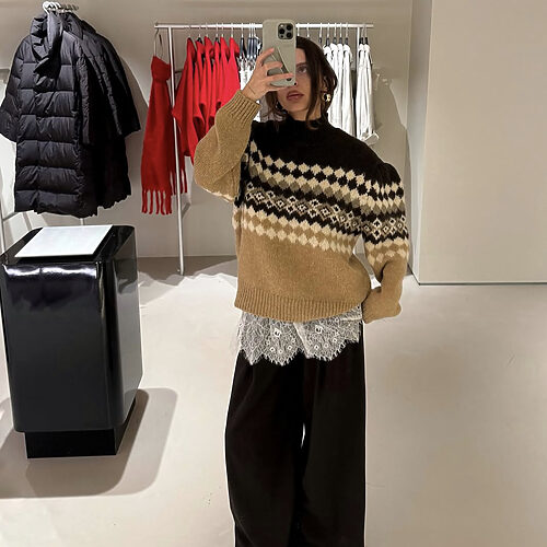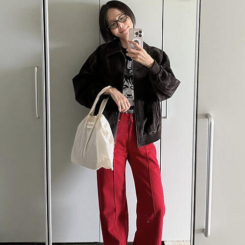 이번엔 파스텔 컬러로 내기 힘든 성숙하고 매니시한 무드의 코트 룩을 선보였습니다. 몸의 두 배는 되어 보일 만큼 오버사이즈로 떨어지는 버터색 코트의 프레임이 먼저 눈길을 끄는데요. 여기에 연한 하늘색 셔츠, 자연스레 주름지는 트라우저와 펌프스 힐로 마무리했습니다. 절제된 팔레트 안에서 담백하고 완성도 높은 스타일링을 완성했죠.