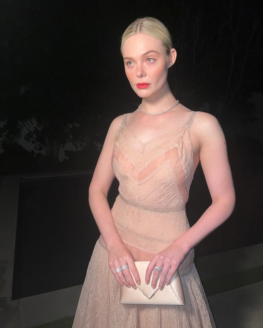 여느 날처럼 해사한 미소를 띠고 뉴욕 MoMA 필름 베네피트 행사에 등장한 엘르 패닝. 스팽글이 촘촘히 박힌 샤넬의 크림 톱과 미디 스커트를 선택했는데요. 몸에 자연스럽게 흐르듯 떨어지는 드레이프 실루엣 덕분에 과하게 꾸민 느낌보다는 수수한 매력이 살아납니다. 계란 모양의 클러치, 메탈릭한 골드 펌프스힐로 작은 디테일까지 포인트를 놓치지 않은 착장이었죠.