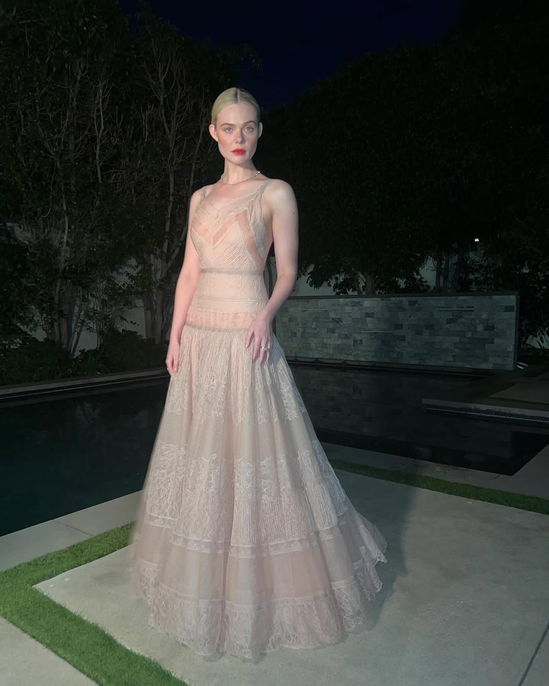 공식 석상에서도 엘르 패닝의 핑크 룩은 단번에 시선을 사로잡았습니다. 은은한 스팽글 장식이 더해진 구찌의 튜브톱 A라인 드레스로 바비 인형처럼 사랑스러운 자태를 뽐냈죠. 잘게 넣은 웨이브 헤어와 실버 액세서리로 공주님 같은 시상식 룩을 완성했네요.