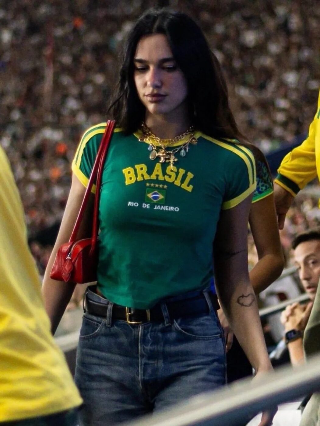 축구장에서도 그녀의 패션 센스는 열일 모멘츠를 뽐냈습니다. 가족들과 함께 플루미넨시와 플라멩구의 축구 경기를 보러 간 그녀는 플루미넨시 구단이 선물한 브라질 국가대표 컬러의 베이비 티셔츠에 스트레이트 진으로 타이트한 실루엣을 선보였는데요. 여기에 빈티지한 참들이 달린 체인 목걸이와 이어링, 그리고 귀여운 레드 백으로 포인트를 줘 한층 더 경쾌한 분위기의 브라질 코어 스타일이 완성됐죠.