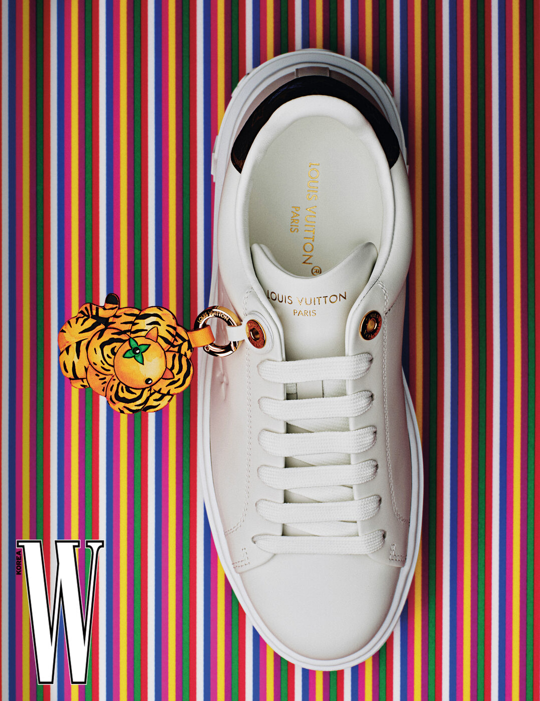 호랑이 참이 달린 타임 아웃 스니커즈는 루이 비통 제품.
