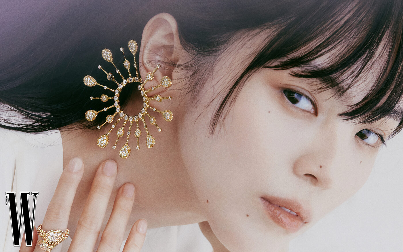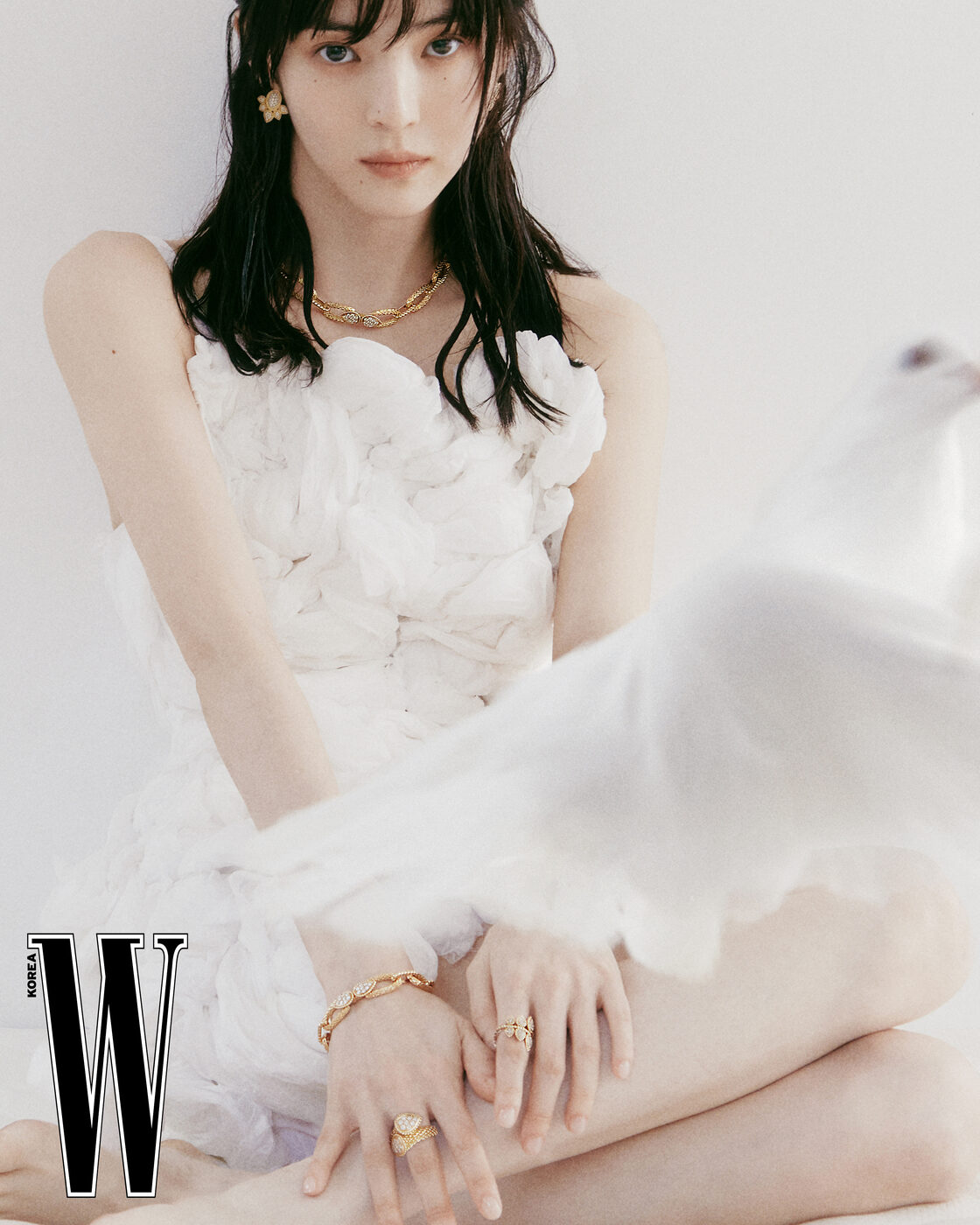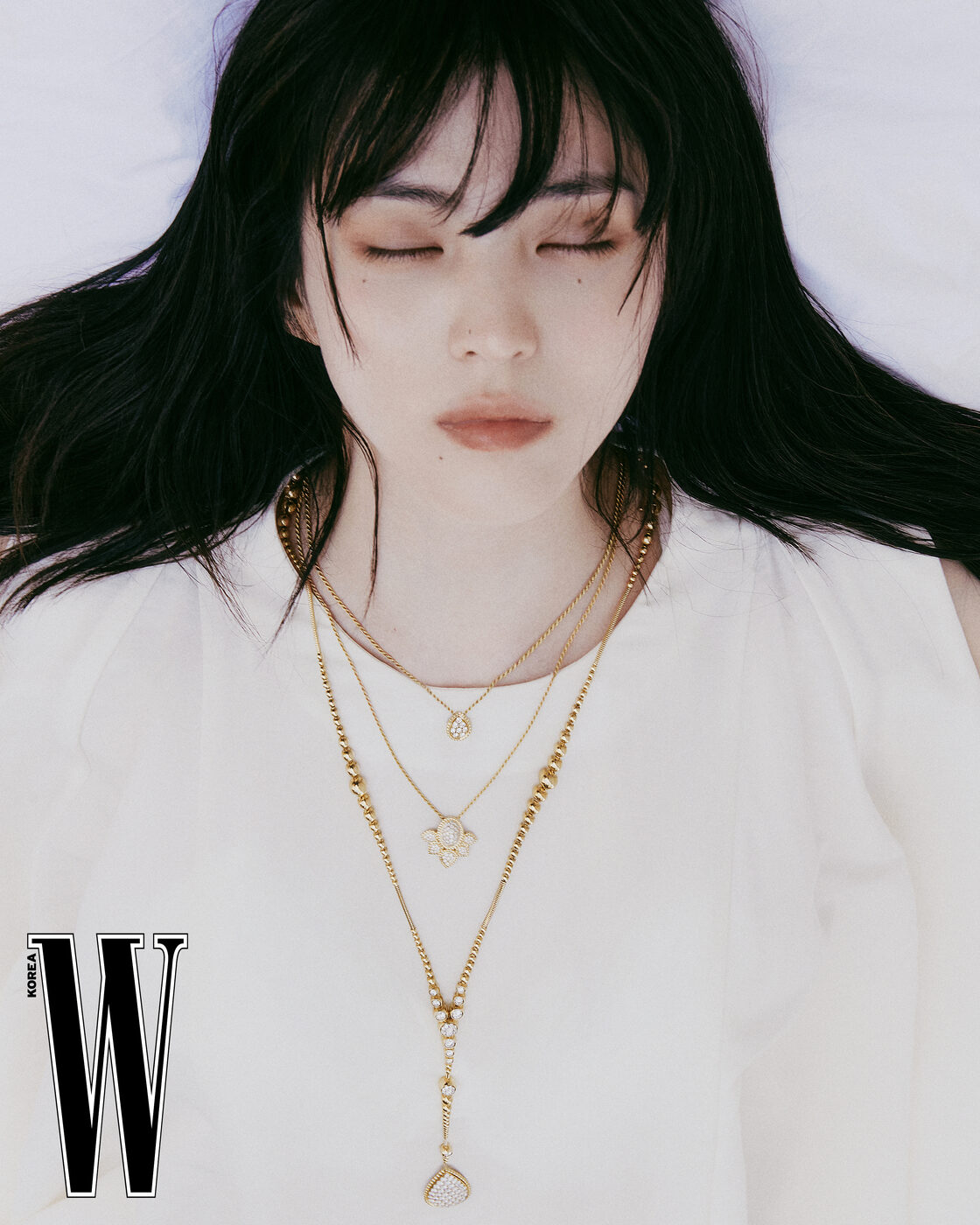 라운드 다이아몬드 30개를 세팅한 화이트 골드 M 드롭 이어링은 쎄뻥 보헴 슬리퍼스 M 이어링, 라운드 다이아몬드 736개(29캐럿)를 세팅한 화이트 골드 네크리스는 쎄뻥 보헴 23-모티브 화이트 골드 네크리스, 오른손 약지에 낀 라운드 다이아몬드 16개를 파베 세팅한 드롭 모티프의 쎄뻥 보헴 투헤드 링, 왼손 검지에 낀 18K 화이트 골드, 라운드 다이아몬드 46개(3.58캐럿) 세팅의 쎄뻥 보헴 화이트 골드 엑스라지 링은 Boucheron 제품. 슬리브리스 드레스는 Bmuet(te) 제품.