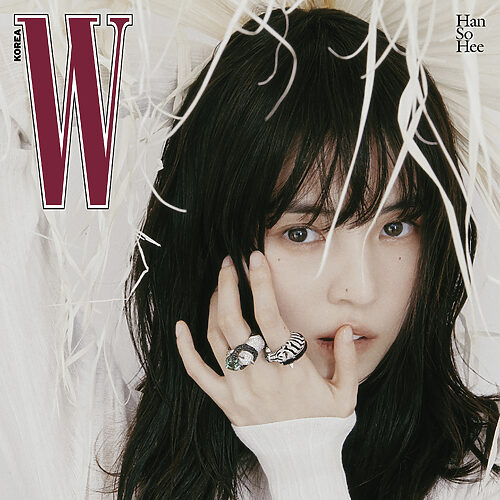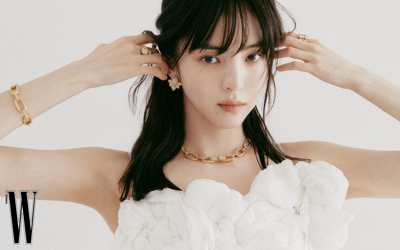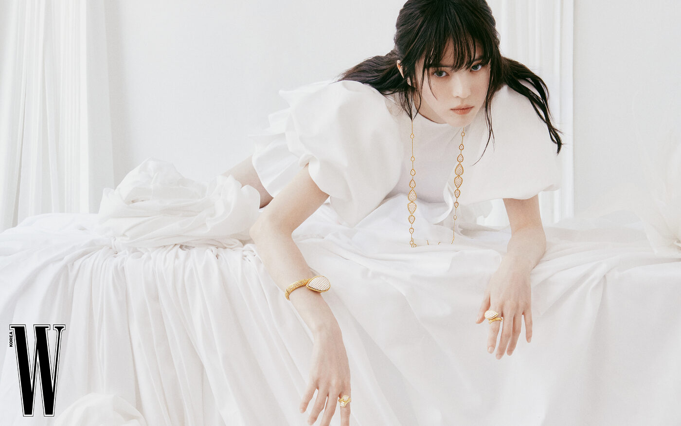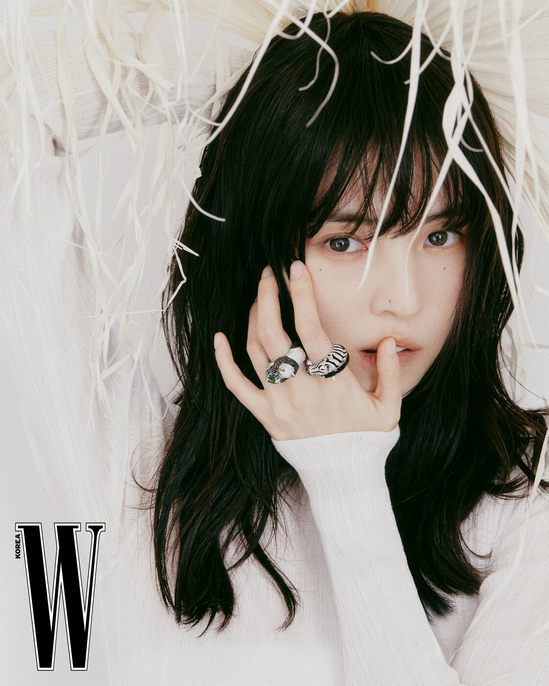라운드 다이아몬드 30개를 세팅한 화이트 골드 M 드롭 이어링은 쎄뻥 보헴 슬리퍼스 M 이어링, 라운드 다이아몬드 736개(29캐럿)를 세팅한 화이트 골드 네크리스는 쎄뻥 보헴 23-모티브 화이트 골드 네크리스, 오른손 약지에 낀 라운드 다이아몬드 16개를 파베 세팅한 드롭 모티프의 쎄뻥 보헴 투헤드 링, 왼손 검지에 낀 18K 화이트 골드, 라운드 다이아몬드 46개(3.58캐럿) 세팅의 쎄뻥 보헴 화이트 골드 엑스라지 링은 Boucheron 제품. 슬리브리스 드레스는 Bmuet(te) 제품.