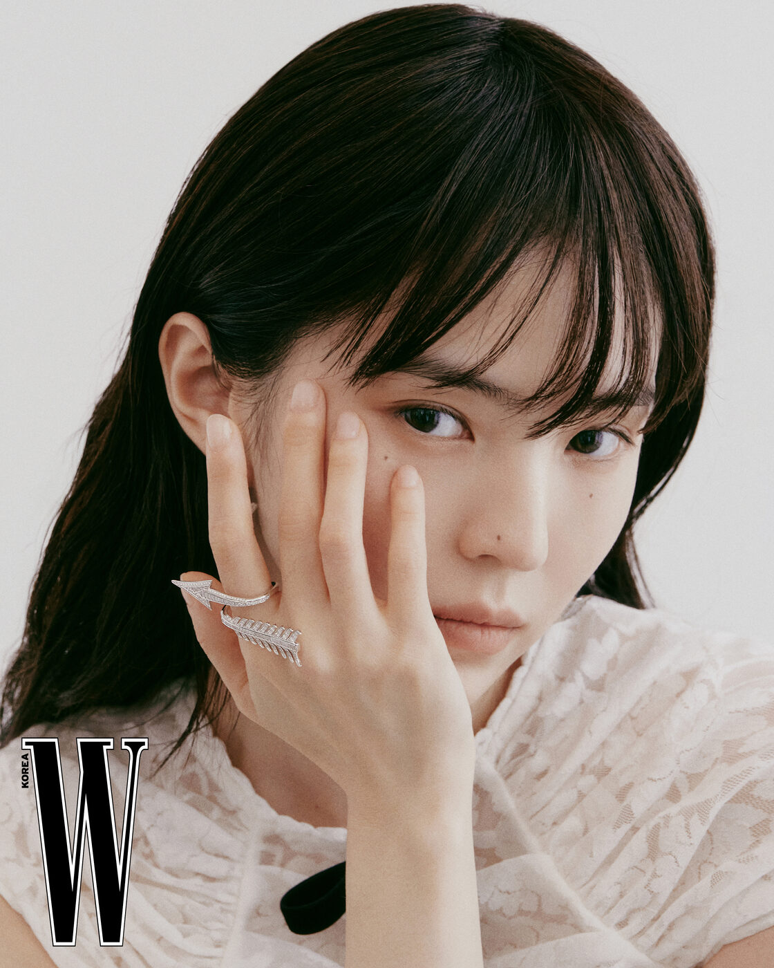 라운드 컷 화이트 다이아몬드 144개(0.80캐럿), 테이퍼드 컷 화이트 다이아몬드 36개(0.76캐럿)를 세팅한 화이트 골드 소재의 플레쉬 다이아몬드 링은 Boucheron 제품. 레이스 톱은 ShuShuTong 제품.