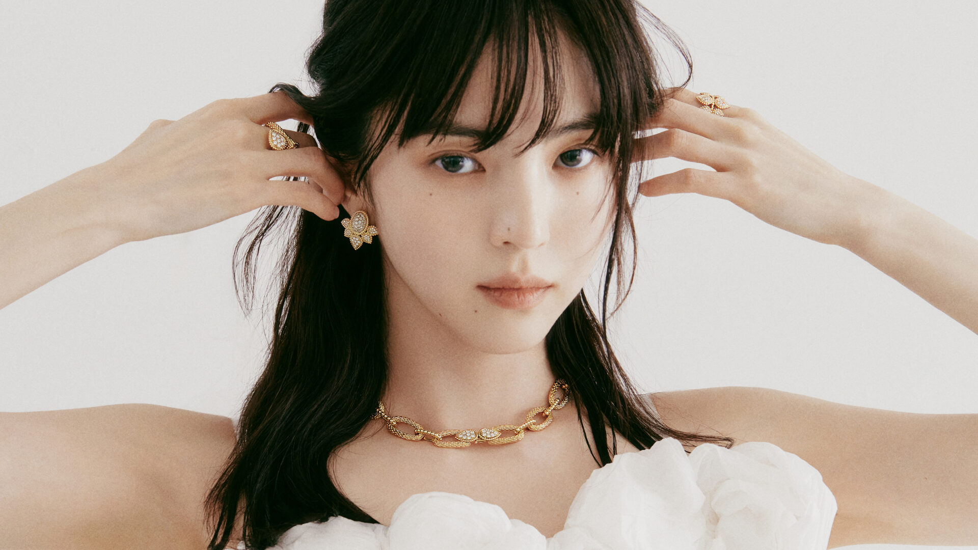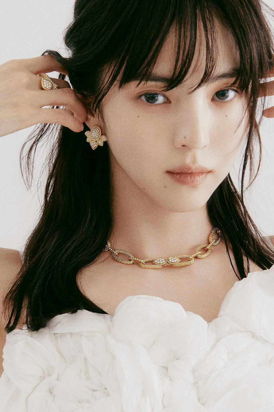1970년대 아카이브 작품에서 영감을 받은 18K 옐로 골드, 라운드 다이아몬드 154개(1.58캐럿) 세팅의 쎄뻥 보헴 빈티지 옐로 골드 클립 이어링, 다이아몬드를 파베 세팅한 옐로 골드 소재의 쎄뻥 보헴 빈티지 링크 네크리스와 오른손에 찬 쎄뻥 보헴 링크 스몰 브레이슬릿, 중지에 낀 쎄뻥 보헴 투헤드 링, 왼손 검지에 낀 쎄뻥 보헴 멀티 모티브 링은 Boucheron 제품. 드레스는 LEE y. LEE y 제품.