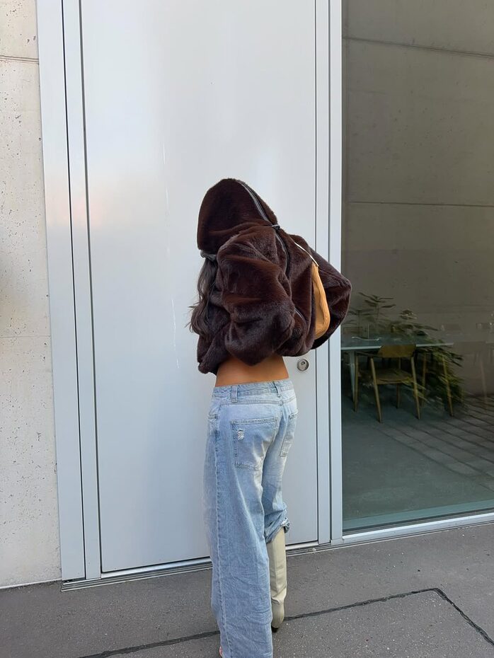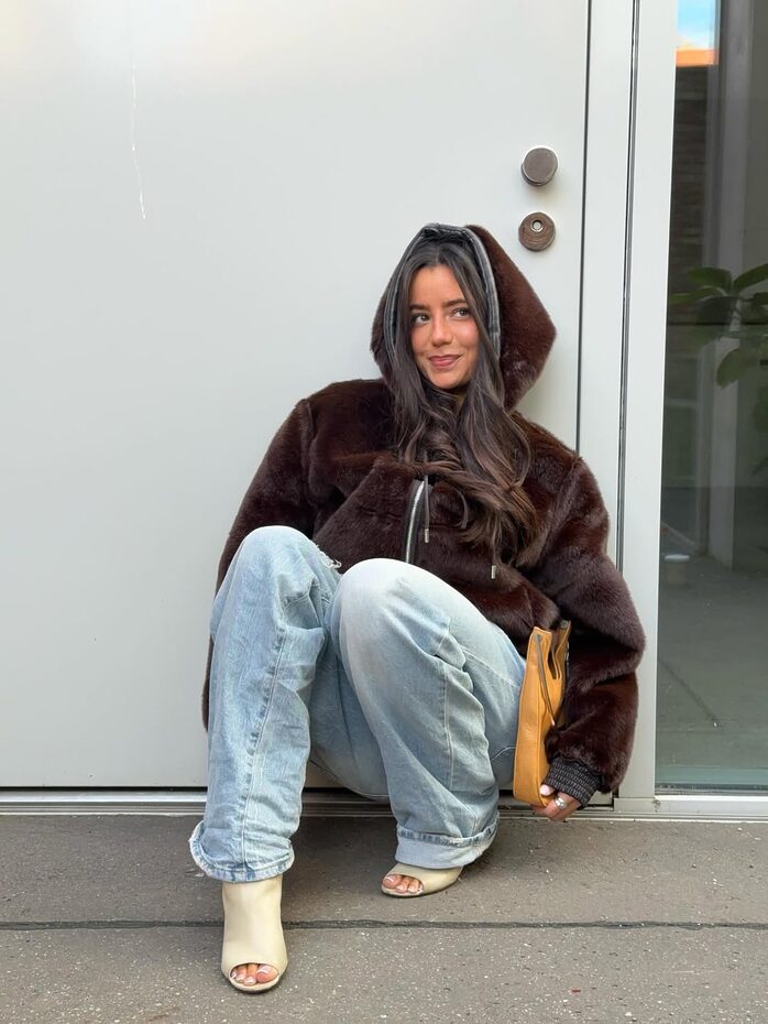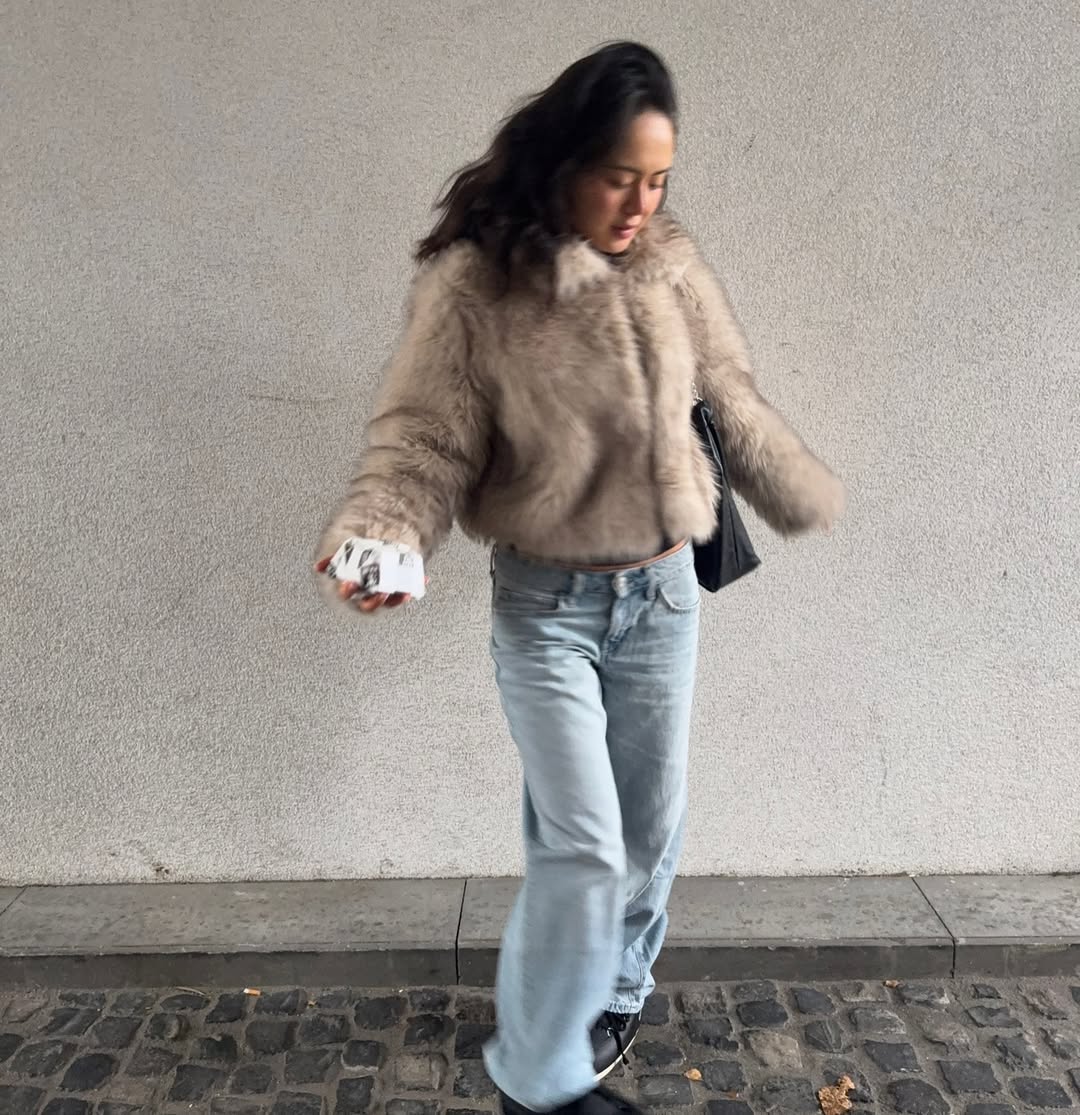 연하고 밝은 색감의 데님 팬츠는 아무래도 추워 보이는 기분이 들기 마련이죠. 계절에 어울리는 따스한 느낌을 가미하려면 풍성한 퍼나 부드러운 시어링 소재처럼 누가 봐도 보온성이 뛰어난 겨울용 아우터를 곁들여 보세요. 발라클라바, 목도리 같은 포근한 기운의 액세서리를 활용하는 방법도 추천!