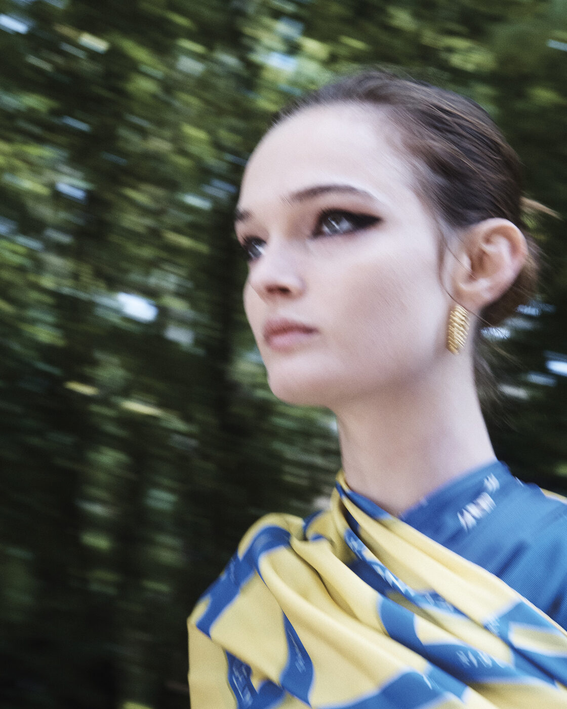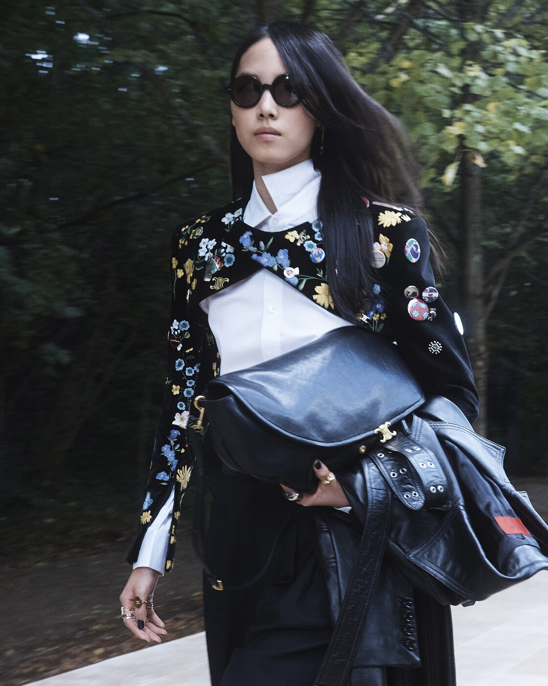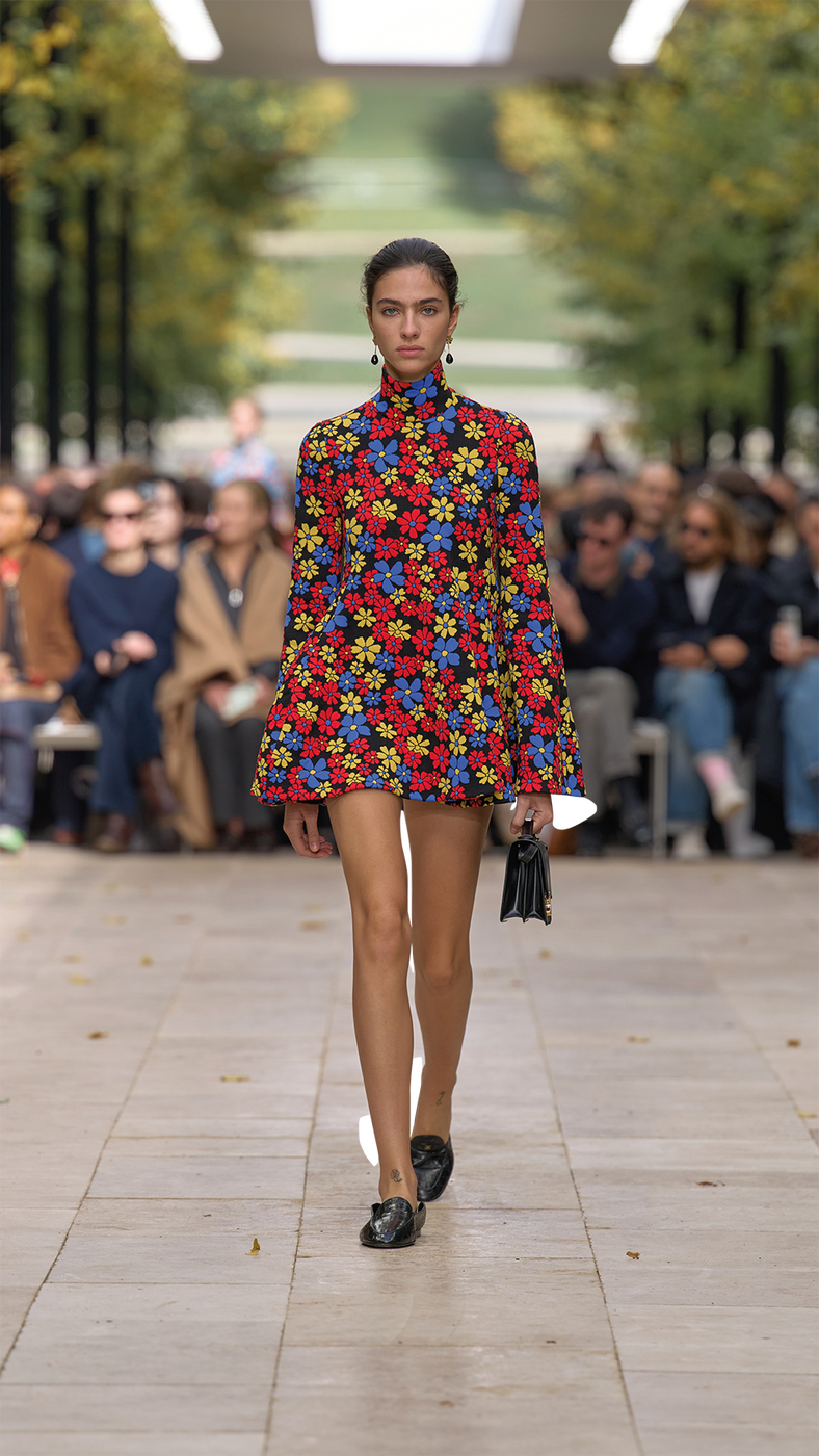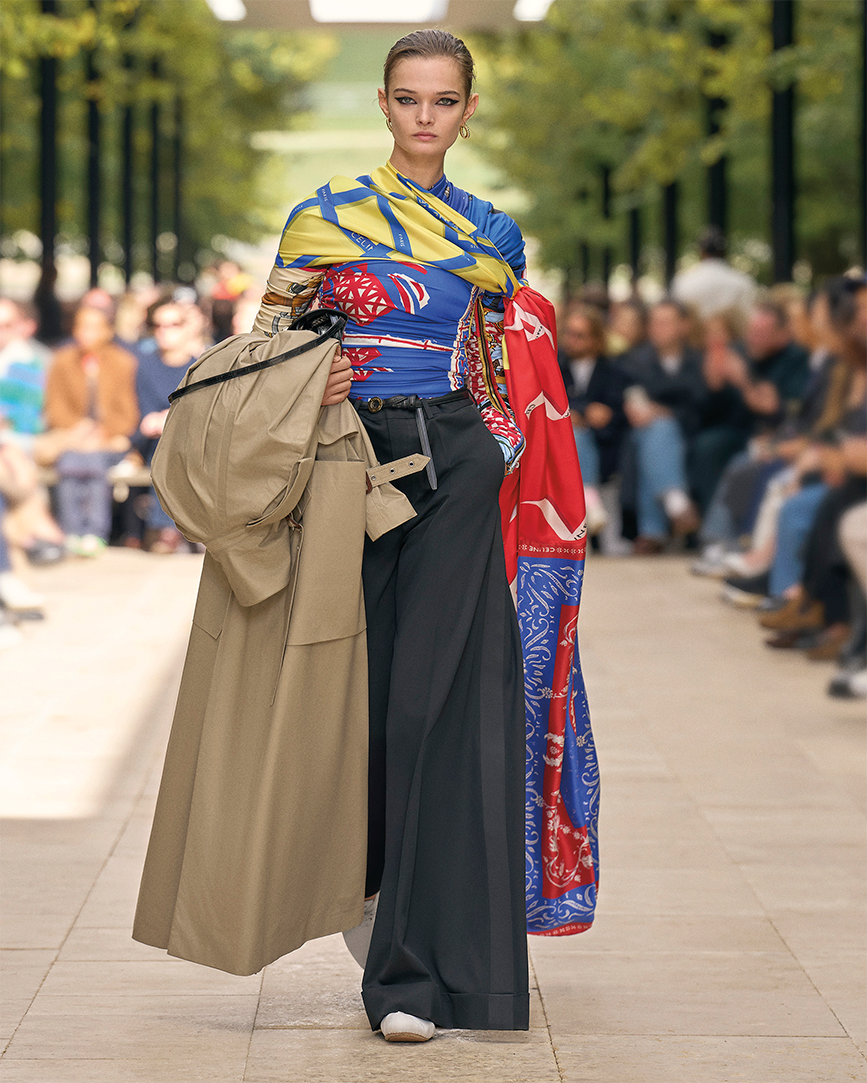 파리 패션위크가 한창이던 지난 10월, 셀린느는 파리 중심부에서 차로 약 1시간을 달려야 도착하는 생클루(Parc de Saint-Cloud) 국립공원으로 초대했다. 드넓은 공원에 잘 정돈된 잔디와 그림 같은 구름이 걸린 푸른 하늘, 녹음이 채 가시지 않은 야외 공원 한가운데, 천장이 열린 구조물 위에 세워진 런웨이는 아침의 분주함을 달래주기에 충분했고, 신선한 설렘을 안겼다. “도시를 벗어나 공원에서 시간을 보내는 게 좋을 것 같아서요.” 불편함을 무릅쓰고라도 이곳을 두 번째 컬렉션 장소로 선택한 이유다. 데뷔 쇼를 통해 피비의 파워풀한 여성성이 떠오르는 매니시한 재킷과 에디의 슬림한 레깅스 팬츠, 록시크적인 코드를 접목한 그는 이번에도 셀린느 하우스의 다양한 요소를 토대로 자신만의 활기찬 에너지를 주입했다. 오프닝을 장식한 베이비돌 드레스는 트위드와 사이키델릭한 꽃무늬로 변주되었고, 각진 오버사이즈 형태의 매니시 재킷, 클래식한 네이비블루 블레이저와 태피터 버블 드레스, 블랙 실크 드레이프 톱, 그리고 프레피 룩을 강조한 폴로셔츠가 주요 룩으로 등장했다. 잘 재단된 테일러드 재킷과 클래식 블레이저 등 전통적인 코드의 변주도 흥미로웠지만, 이번 시즌의 하이라이트는 다양한 팬츠 스타일이었다. 스키니 레깅스 팬츠부터 테이퍼드 팬츠, 치노ㆍ하이웨이스트ㆍ 와이드 팬츠, 승마 팬츠까지, 다채롭게 확장된 팬츠 스펙트럼은 무척 인상적이었다. 룩 전반에는 부드럽게 흘러내리는 칼라, 에스닉 주얼리, 낮고 편안한 슈즈, 실용적인 맨 백 등이 자리했다. 과거의 유산과 현재를 연결하는 마이클 라이더 스타일링의 중심에는 이번 시즌 역시 스카프가 자리하고 있다. 또 하나 눈에 띈 아이템은 모델이 팔에 낀 셀린느 로고의 헬멧. 자전거 타기가 라이프스타일이 된 파리에서의 생활이 그에게 영감이 되어준 듯하다. 그는 “스타일리시한 아이들은 모두 팔꿈치에 헬멧을 걸고 쿨하게 스튜디오에 나타나죠”라고 밝히기도 했다.