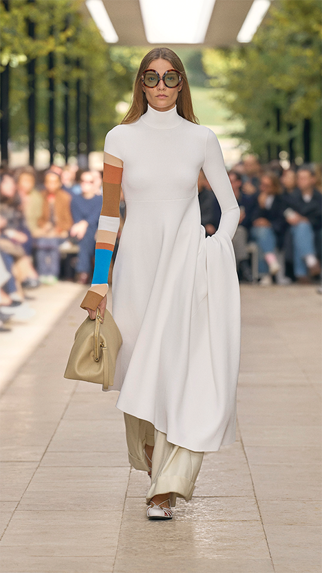 “우리는 이번 컬렉션을 7월 데뷔 쇼의 연장선으로 보았습니다. 여성과 남성은 계속 나아가고 그사이 계절이 바뀌었습니다. 우리는 셀린느의 정체성이 무엇인지, 무엇이 아닌지에 대해 줄곧 탐색했습니다. 나아가 즐거운 시간, 경쾌함 그리고 여름의 열기에 대해서도 생각했죠. 신중함과 살갗을 드러내는 것, 그 사이의 긴장감. 오래 지속되는 것과 찰나의 것에 대해서도요. 우리가 차려입는 옷과 신발, 그 모든 것이 어떻게 추억의 일부가 되는지를 살피고 연구하고 고민했습니다.” 마이클 라이더의 말처럼, 계절의 변화를 온전히 품은 생클루에서의 쇼는 자연스럽고 담백한 방식으로 우리에게 가을의 추억으로 남아 있다.