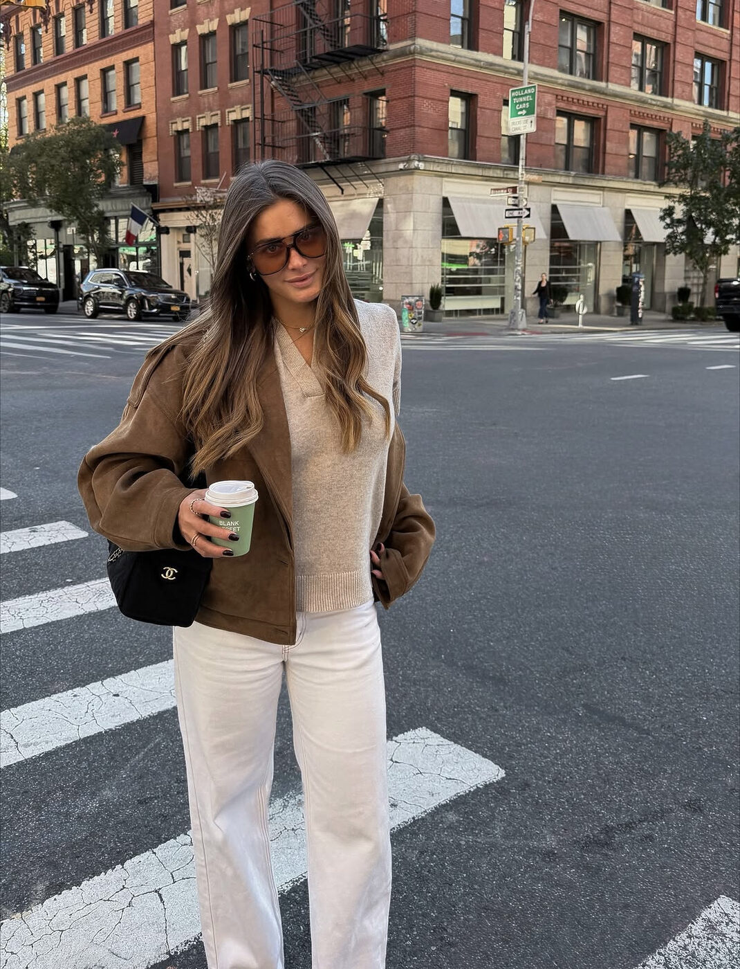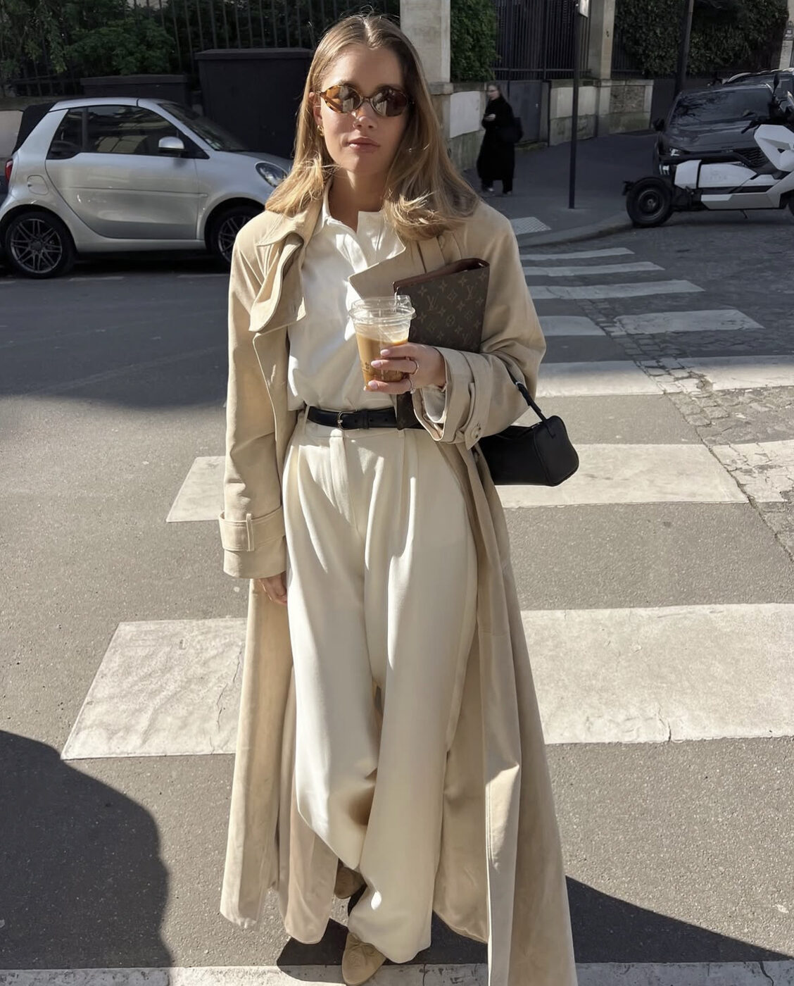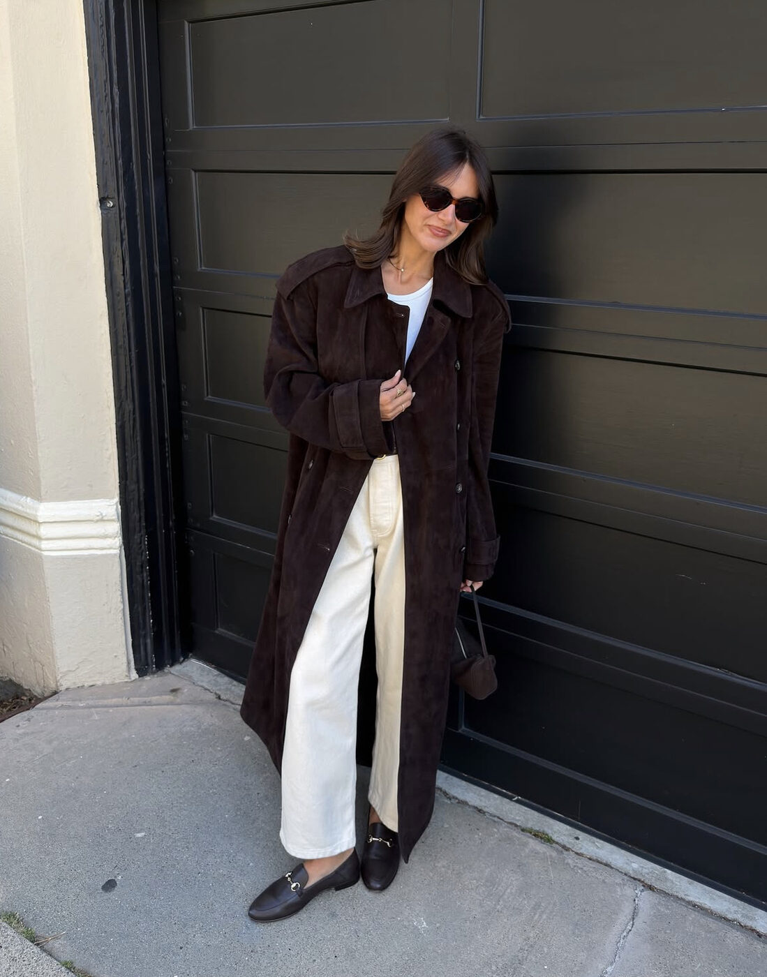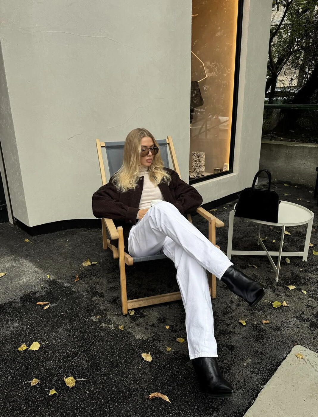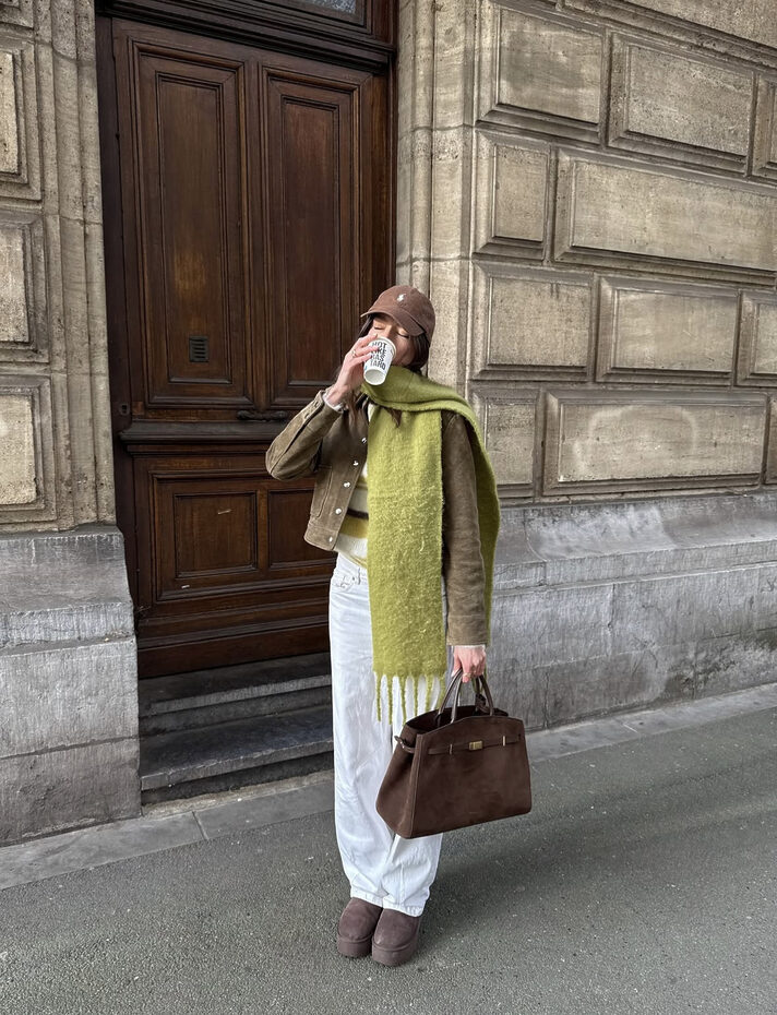 하얀 바지를 특히 겨울에 더 자주 찾게 되는 이유? 이 조합을 보면 더 명확해집니다. 짙은 브라운 코트와 그 무게감을 덜어줄 완벽한 기능을 하는 장치죠. 옷 잘 입는 언니들도 진한 브라운 스웨이드 코트와 그 안에 크림 팬츠를 입어 두 가지 색의 무게 차이를 활용했어요. 하얀색이 진한 색과 붙었을 때, 겨울 아우터의 어두운 농도를 떨어트리고 싶을 때 가장 손쉬운 방법이겠네요. 상의도 화이트 티셔츠로 매치해 밝기를 끌어올려 주는 대신, 신발과 가방은 아우터와 동일하게 짙은 갈색으로 연결해 동떨어져 보이지 않고요.