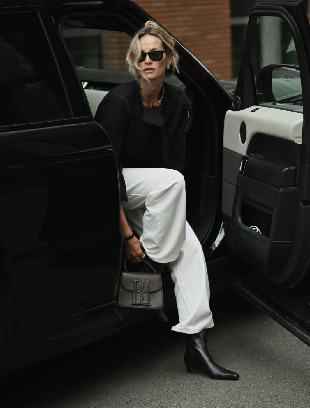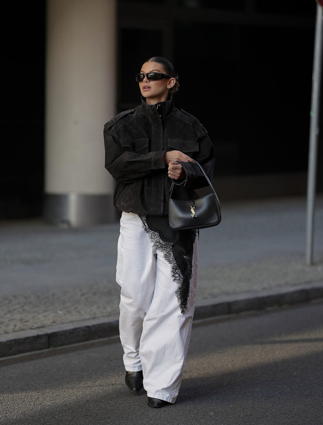 만약 아우터가 짧은 기장이라면, 극명하게 나뉘는 상하의 컬러의 경계가 부담스러울 수 있습니다. 심지어 오프 화이트 컬러의 팬츠라면요. 이때 필요한 것은 그 간극을 메워줄 디테일입니다. 소피아는 재치 있게 레이스 슬릿이라는 아이템을 가져왔네요. 바지 한쪽을 슬쩍 가리는 것만으로 수직으로 딱 나뉘어버린 검은색과 흰색의 조합을 부드럽게 풀어줍니다.