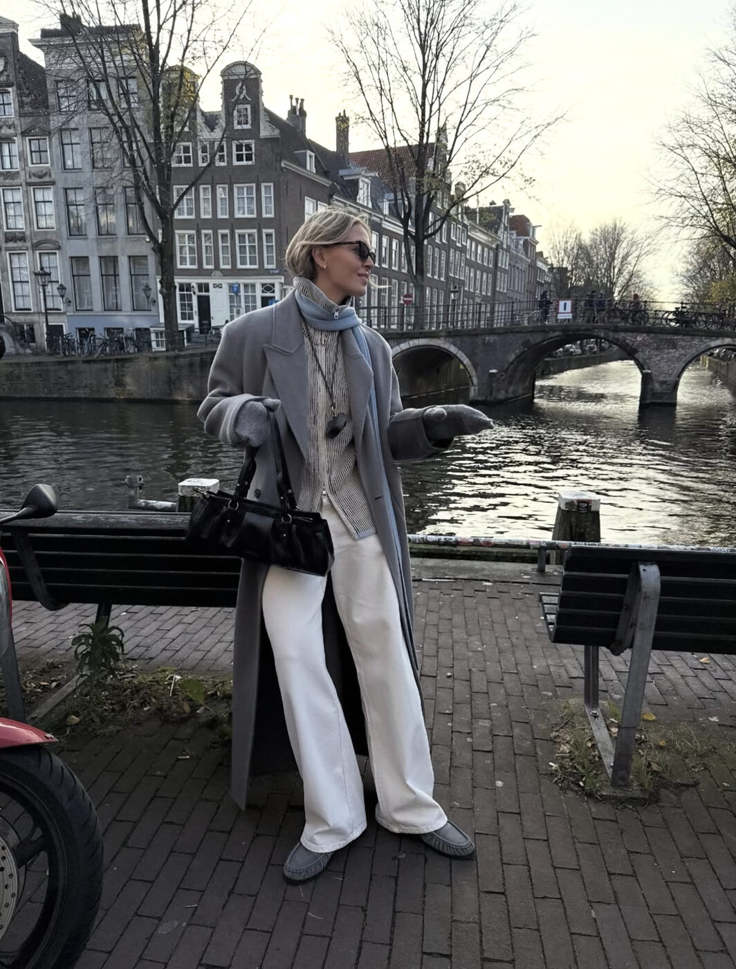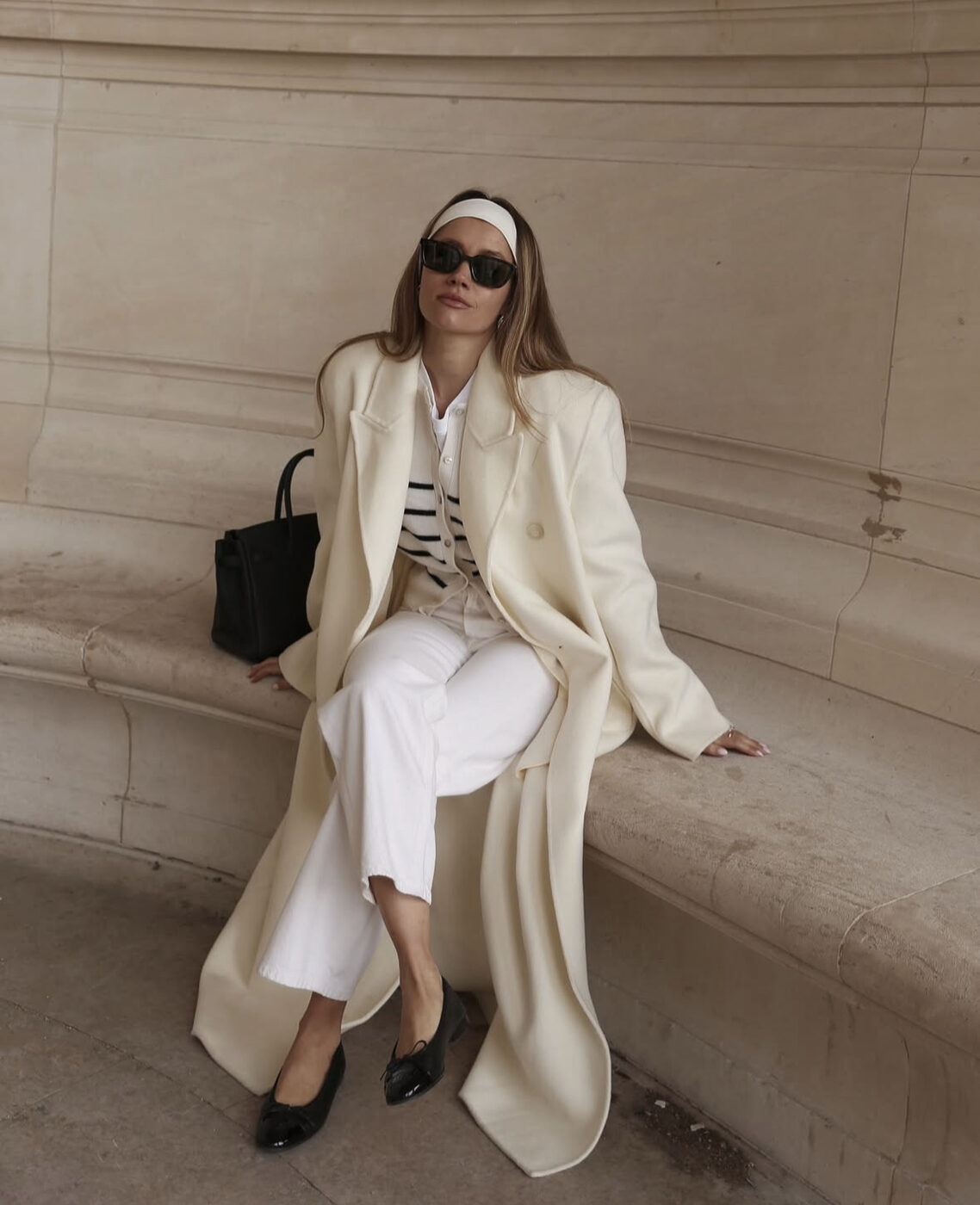 특히 밝은 계열의 퍼 코트나 크림색 롱 코트를 가지고 있다면 이 바지의 활용폭이 더 넓어질 수 있겠군요. 겨울에는 아우터가 전체 룩의 큰 부분을 차지하니, 이렇게 밝은 팬츠를 더해주면 시각적으로 편안하고 고급스러운 무드를 낼 수 있습니다. 그리고 가방이나 신발은 룩과 대비되는 블랙이나 진한 브라운 등의 반전되는 무채색 컬러를 더해보세요.