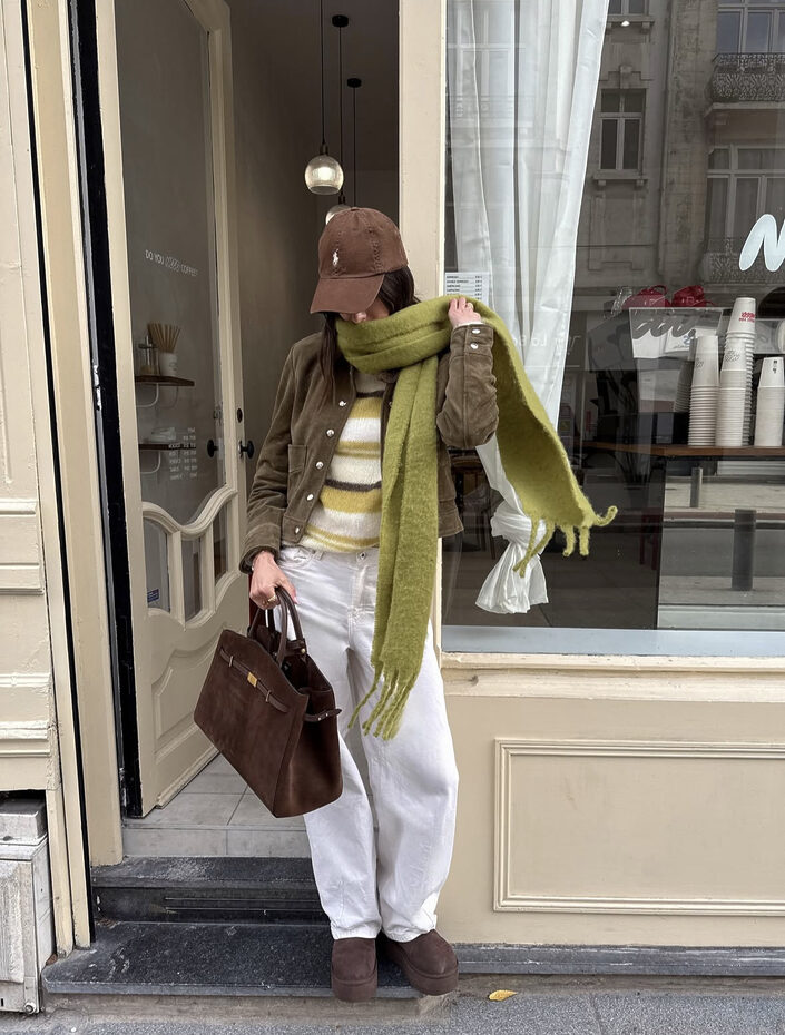 이 바지가 더욱 좋은 점은, 톤이 아무리 제각각이더라도 하얀색이 모든 걸 품어준다는 것. 초록 머플러, 올리브 톤의 아우터, 스트라이프 니트까지 각자 다른 키치한 존재감을 발산하고 있지만, 이 밝은 팬츠가 전체 톤을 부드럽게 만들어줍니다. 어떤 색과 만나도 이 바지는 그렇게 조용하고 차분하게 해주는 저력을 가지고 있어요. 그래서 이것저것 입고 싶을 때, 적당히 멋 부리고 싶을 때 이 흰 바지가 우리에게 좋은 선택지일 겁니다.