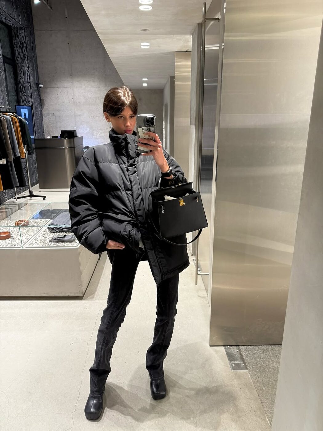 블랙 패딩은 겨울 내내 가장 손이 많이 가는 아우터 중 하나죠. 거리를 나서면 어디서나 마주치는 기본 아이템이기도 합니다. 하지만 ‘옷 좀 입는다’ 하는 사람이라면, 남들과 같은 방식으로 입고 싶진 않을 거예요. 낙낙한 사이즈의 패딩 아우터에 스키니하게 떨어지는 스트레이트 진을 매치해보세요. 여기에 캐주얼한 백팩 대신 클래식한 레더 백을 더하면, 세련되면서도 감각적인 출근 룩이 완성됩니다.