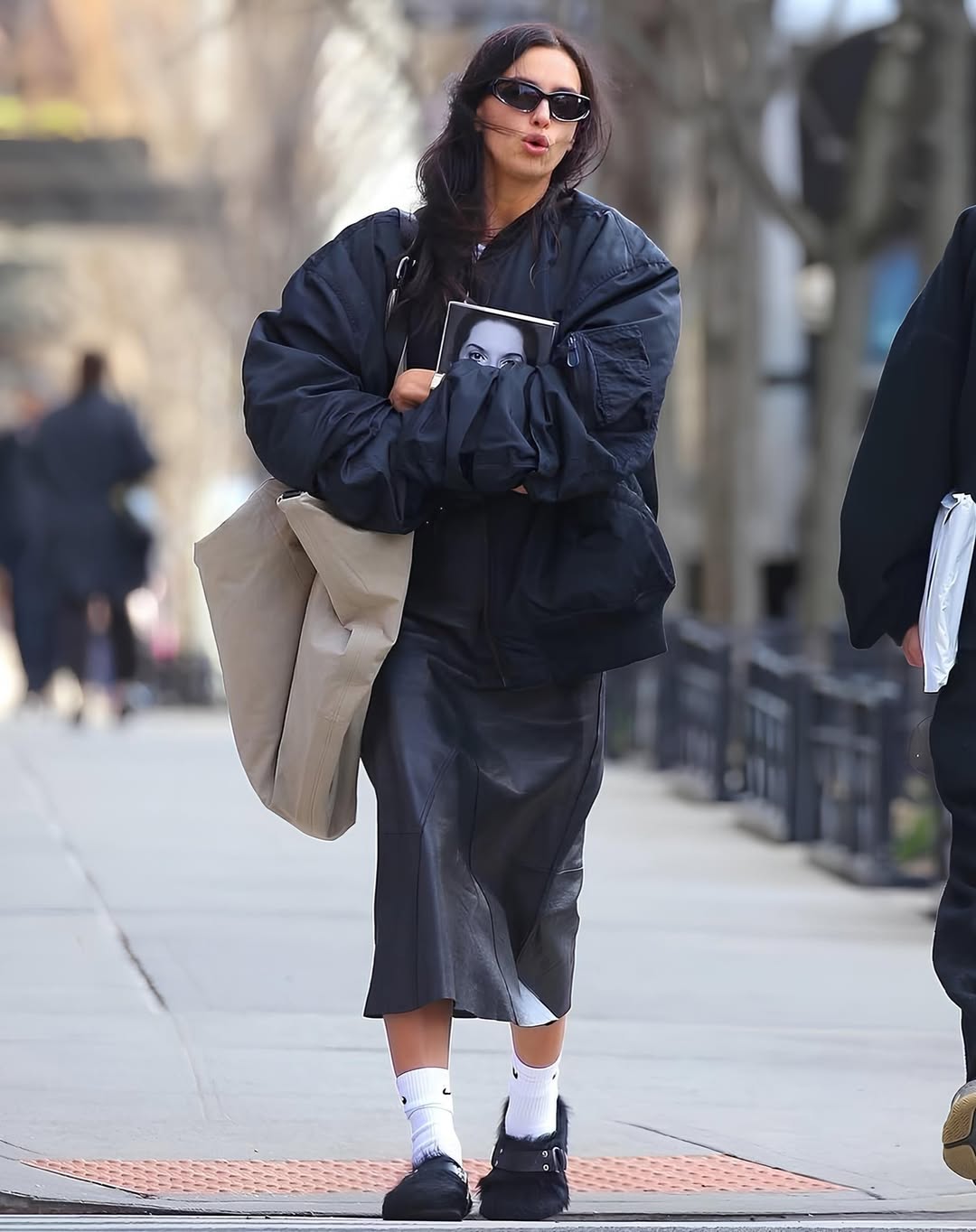 이리나 샤크는 반려견과 산책할 때도, 스케줄을 갈 때도 클로그를 신습니다. 짧은 시간에 편안한 활용도를 자랑하는 슈즈의 힘을 잘 알고 있는 듯한데요. 특히 복슬복슬한 털이 발을 감싸는 디자인의 클로그를 유독 애정하죠. 평소 즐겨 입는 올블랙 룩에 메탈릭 장식의 스트랩 디테일이 있는 아이템이나 심플한 브라운 퍼 클로그를 주기적으로 착용하는데요. 칙칙하고 묵직한 옷차림 속 발끝에 부드럽고 편안함을 주는 아이템으로 여유를 드러냈습니다.