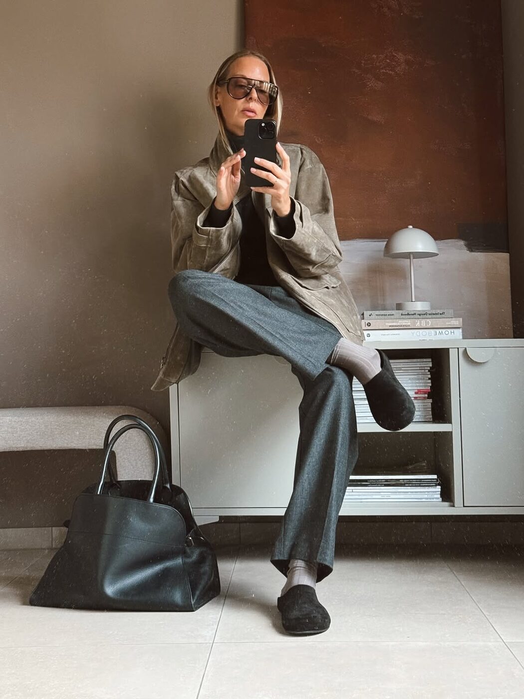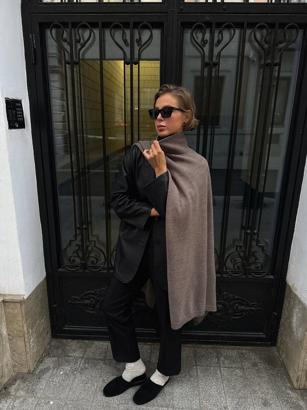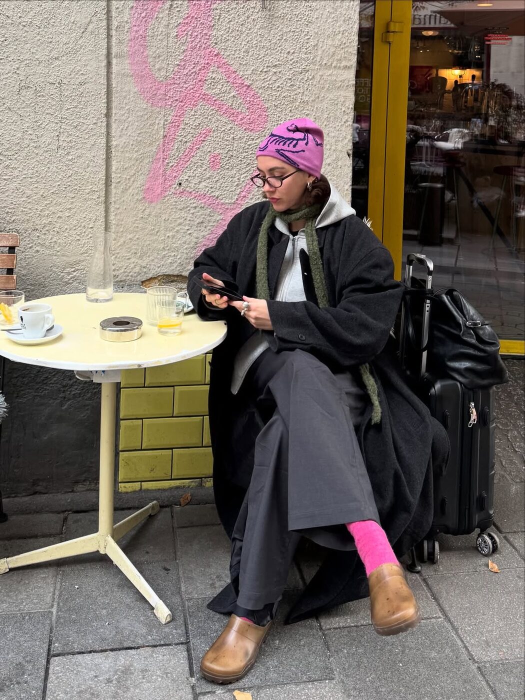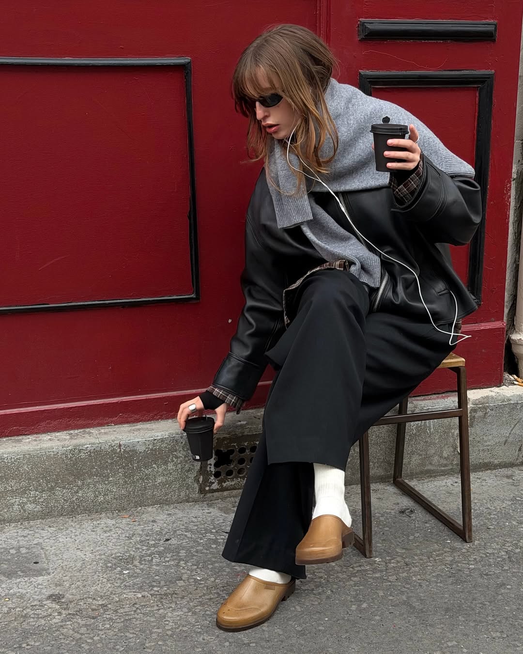 흔히 봐오던 넓은 곡선 형태의 클로그와 다르게 앞 코가 뾰족하고 얄쌍한 디자인의 클로그가 이색적입니다. 덕분에 미니멀하고 세련된 옷차림과도 잘 어울려 우아하죠. 반면 소재만 달라져도 무드가 한껏 달라지는데요. 러버 소재의 클로그는 캐주얼한 매력을 줍니다. 카멜 클로그를 선택한 시나 안줄리나와 로레나는 레더 재킷, 비니, 컬러 양말 등 존재감이 강한 아이템들을 매치해 주었는데요. 여기에 단정한 디자인의 슈즈를 신어 과하지 않은 깔끔한 스트리트 무드가 연출됐죠.