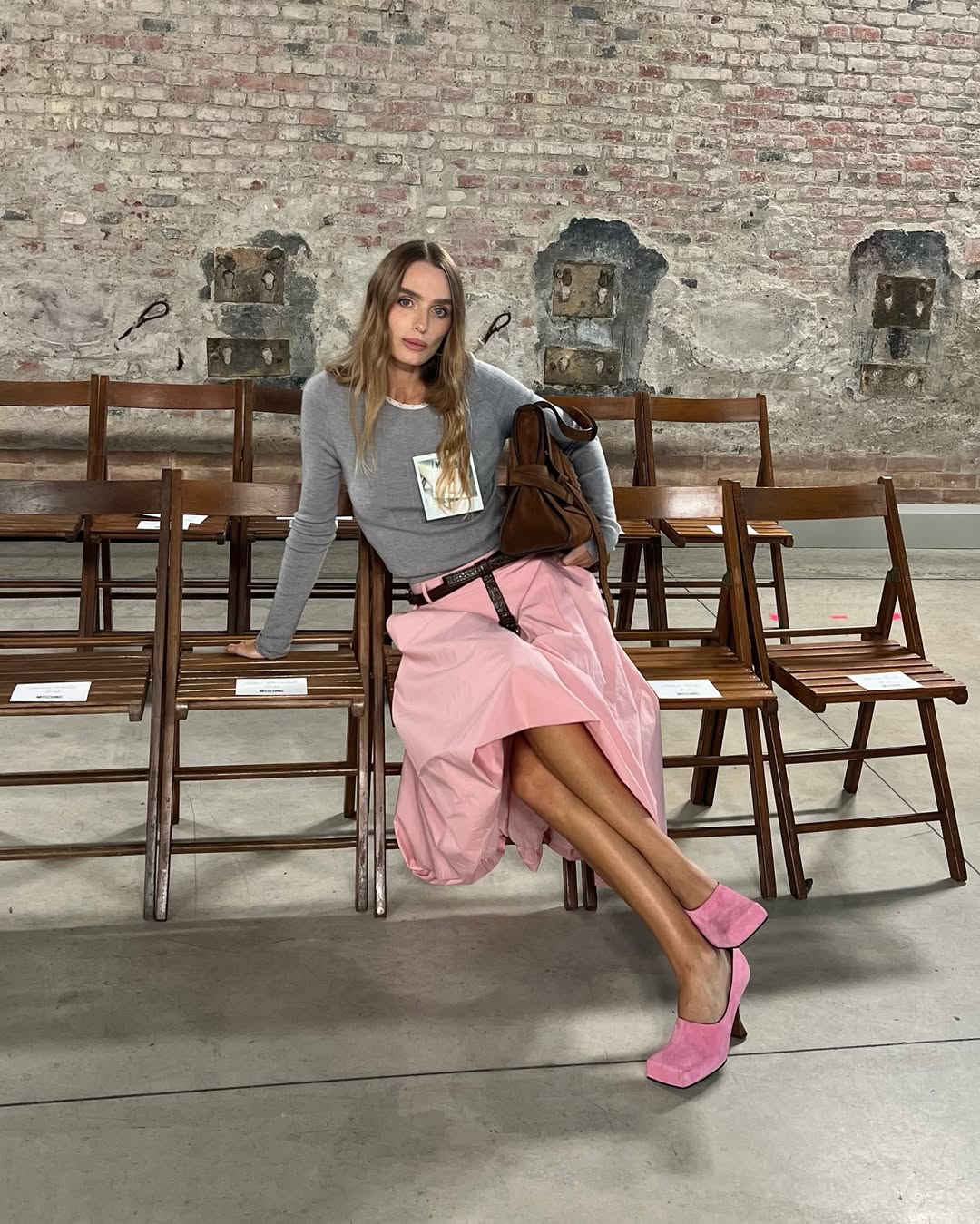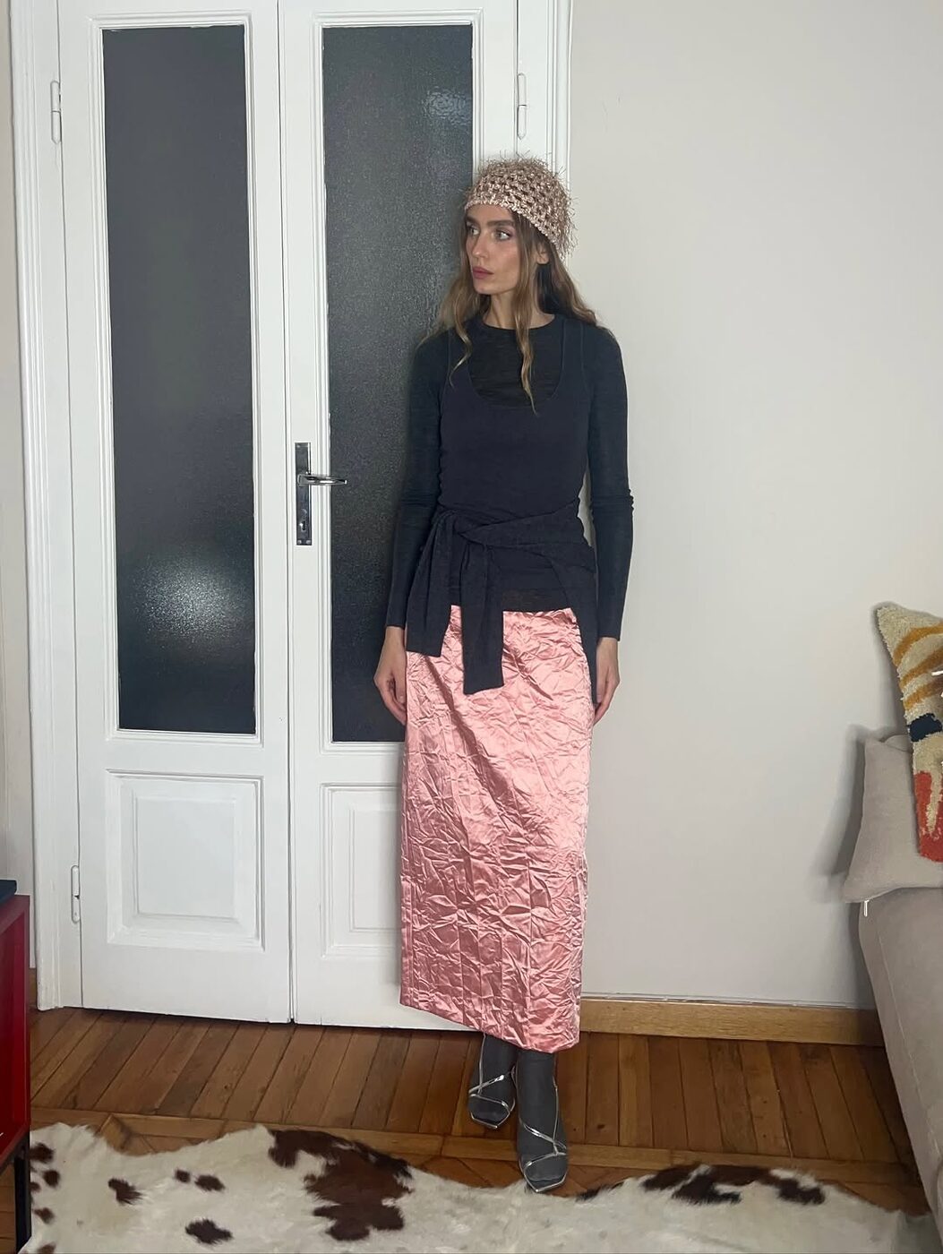 니트로 워밍업 했다면 이번엔 스커트로 분위기를 바꿔볼 차례예요. 핑크 스커트는 그 자체만으로도 로맨틱한 분위기를 만들어주는 아이템이기 때문에 상의는 그레이나 블랙, 또는 화이트 같은 무채색 컬러와 매치하는게 좋아요.