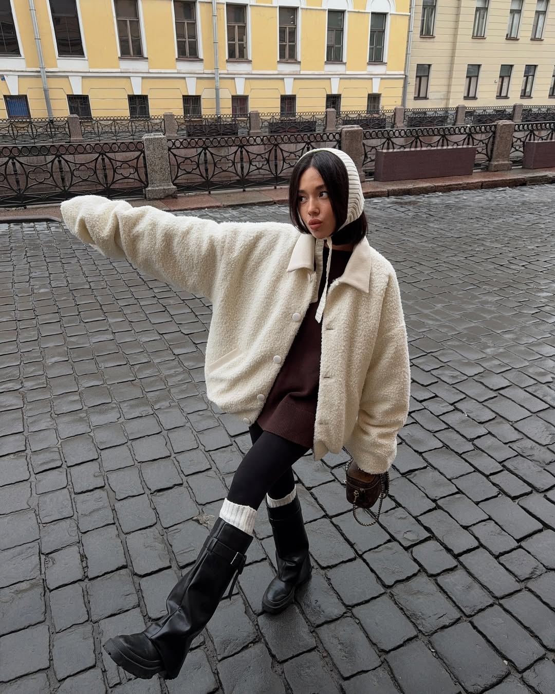 레그워머만 있으면 옷장 깊이 넣어두었던 짧은 하의를 겨울에도 충분히 즐길 수 있어요. 허벅지까지 길게 끌어올려 연출하면 롱 부츠 없이도 다리가 길어 보이는 실루엣과 보온성을 동시에 챙길 수 있죠. 페미닌한 룩을 선호한다면 플랫 슈즈와 조합해 러블리한 포인트를 더해보는 것도 좋습니다.
