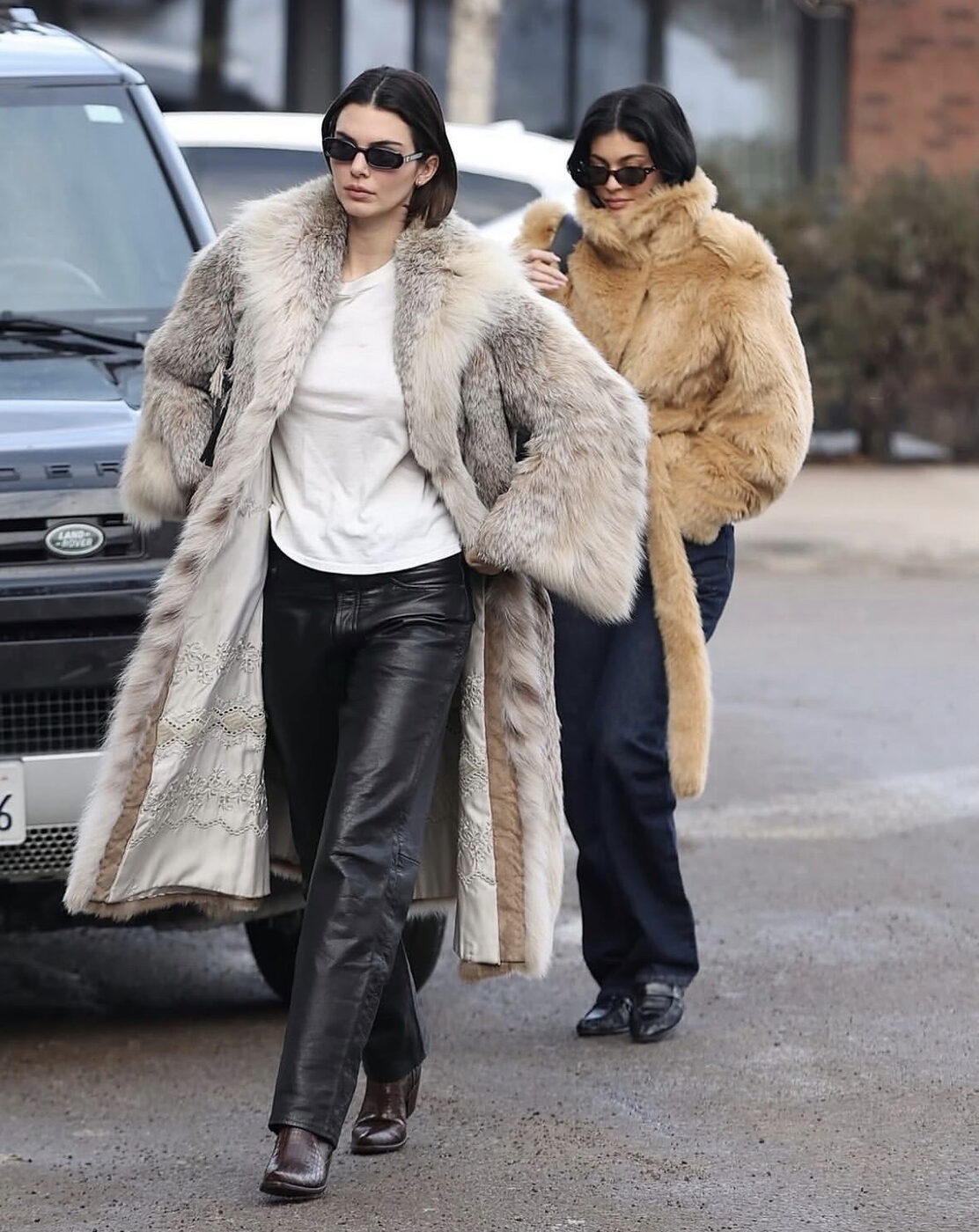 제너 자매 둘의 추구미가 여기서도 드러납니다. 켄달 제너는 긴 퍼 코트에 스트레이트 핏 레더 팬츠를 매치해 군더더기 없는 쿨하고 멋진 옷차림을 완성했습니다. 코트를 잠그지 않고 활짝 열어 블랙 앤 화이트 룩이 더 확실히 보이니, 더 말끔하고 미니멀해 보이기도 하죠. 그 옆에 보이는 카일리 제너는 숏한 기장감의 아우터를 목까지 꽉 잠그고 진청 데님과 로퍼로 데일리하게 마무리했군요. 공통점은 둘 다 스트레이트 핏의 너무 와이드하지 않은 하의를 매치했다는 점입니다.