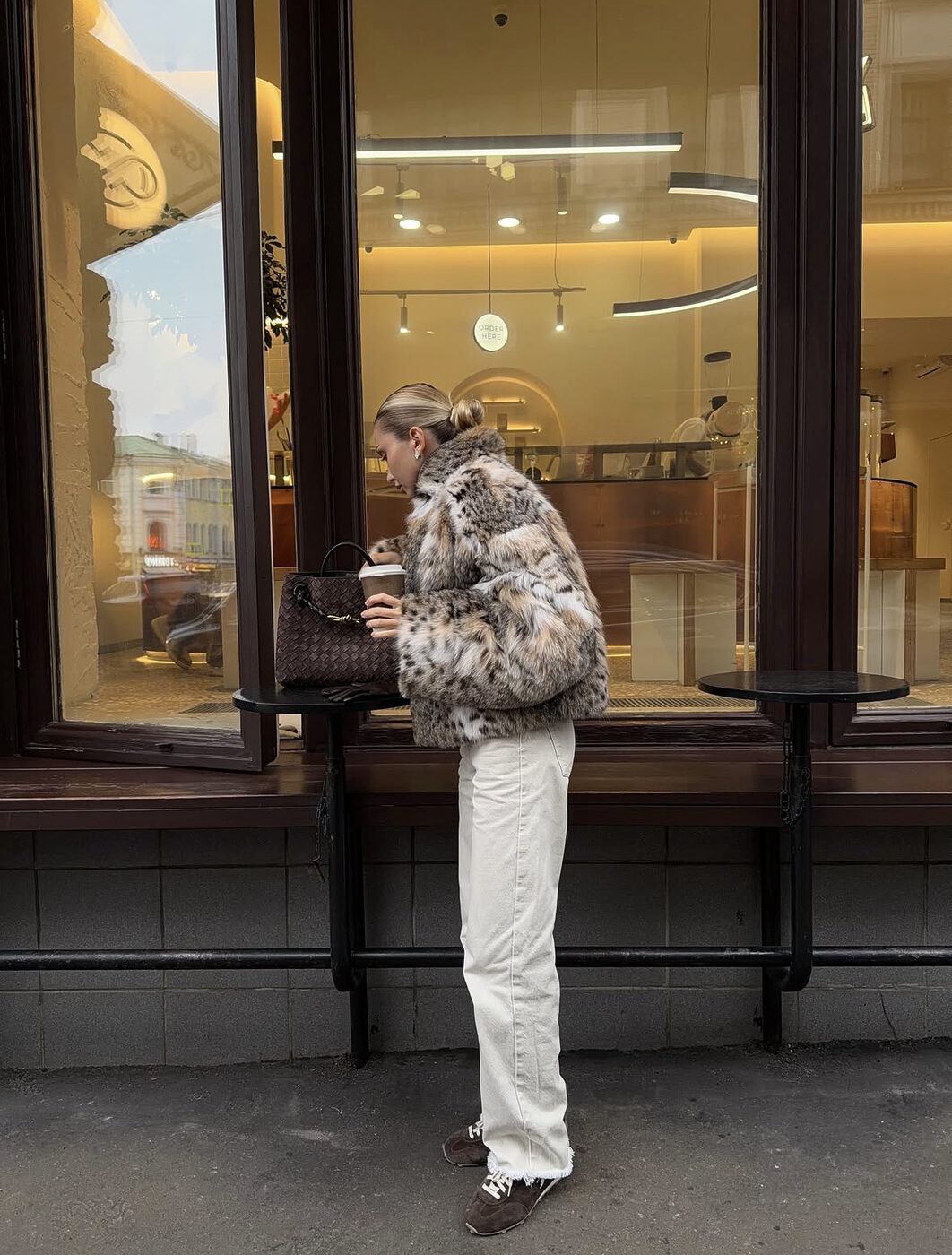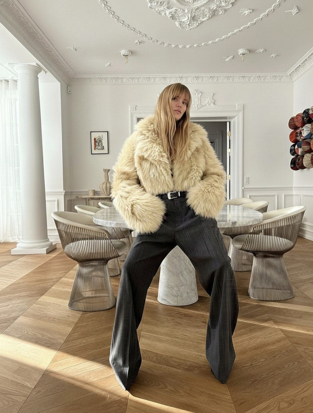 퍼 아우터를 더욱 차분하고 고급스럽게 입고 싶다면, 크림색이나 아이보리처럼 깨끗한 컬러를 하의로 매치해 보세요. 특히 퍼 컬러에 흰색이 있거나 부드러운 컬러들이 있으면 더 좋고요. 이렇게 톤온톤으로 팔레트를 구성하면 전체적으로 깔끔하고 화사해 보여 얼굴빛도 밝아 보일 겁니다.