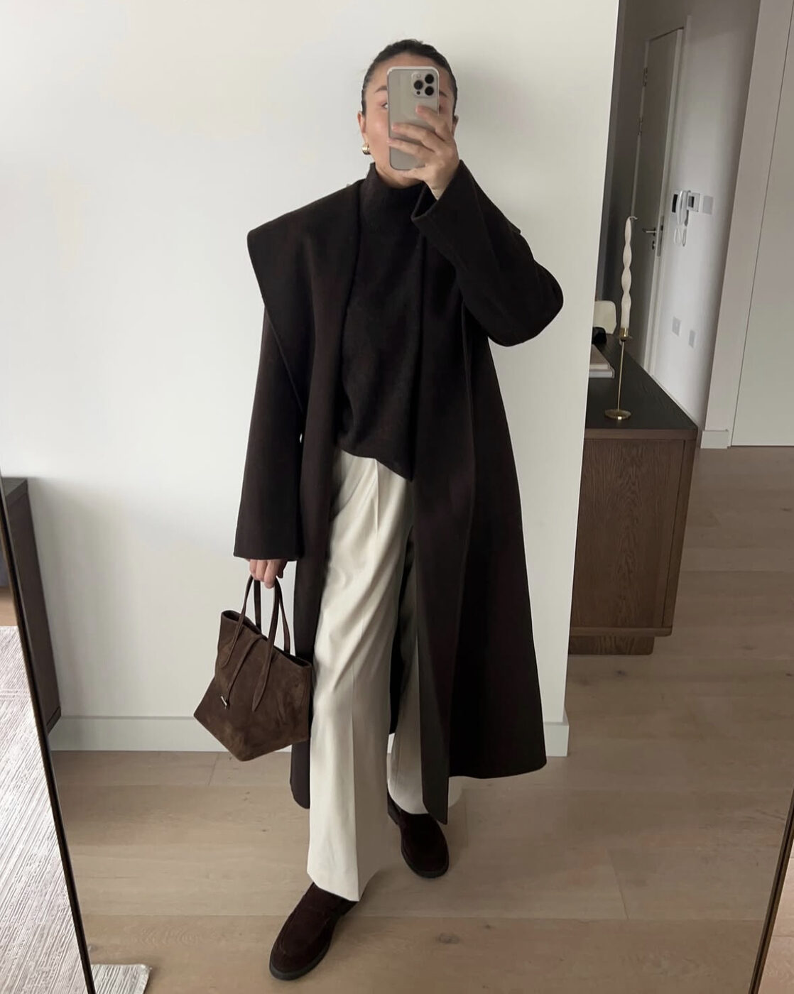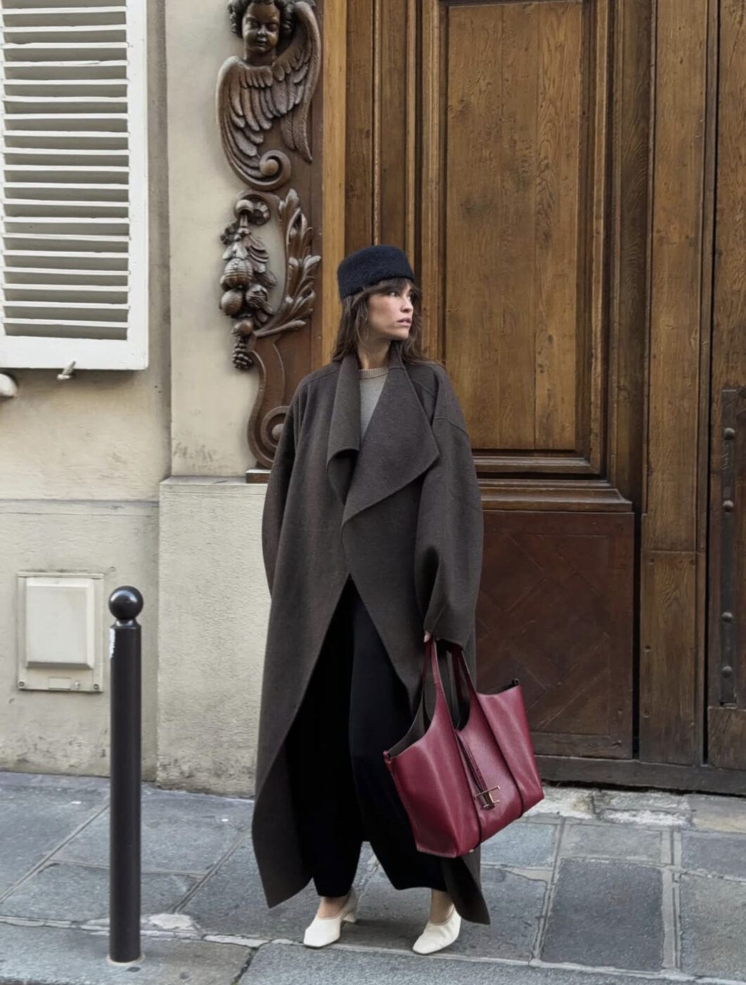 다른 코트처럼 버튼을 꼭 채우거나 그러지 않아도 여유로워 보이는 가운형 코트의 장점이 딱 드러나는 고급스러운 룩이군요. 아침에 이너를 막 입어도 코트가 포근하게 가려주니 고민 없이 입기 좋고요. 큰 버건디 백처럼 존재감 있는 가방을 들어도 펄럭이는 실루엣과 맞물려 과해 보이지 않는 것도 장점입니다.