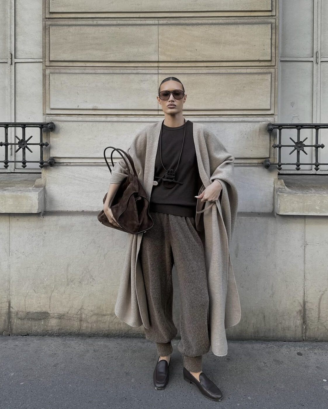 노력은 최소한으로, 결과는 최대치로 뽑고 싶은 날 있잖아요? 이 가운 코트만큼 확실한 선택지도 드물 겁니다. 안에는 브라운 톤의 니트와 토프 톤의 니트 바지, 겉에는 베이지 그레이 컬러가 오묘하게 섞인 코트를 매치해 한 세트로 보이게끔 했습니다. 이너와 톤을 조용하게 맞춰 더 센스 있어 보이기도 하네요. 액세서리가 필요하다면, 볼드한 목걸이나 선글라스를 더해도 과하지 않게 어울릴 거예요.