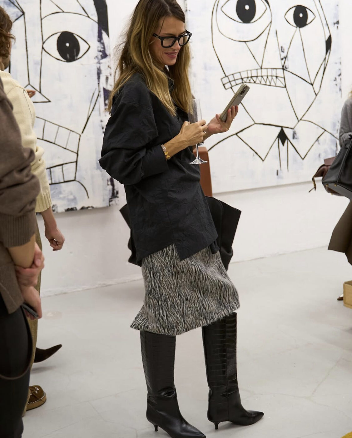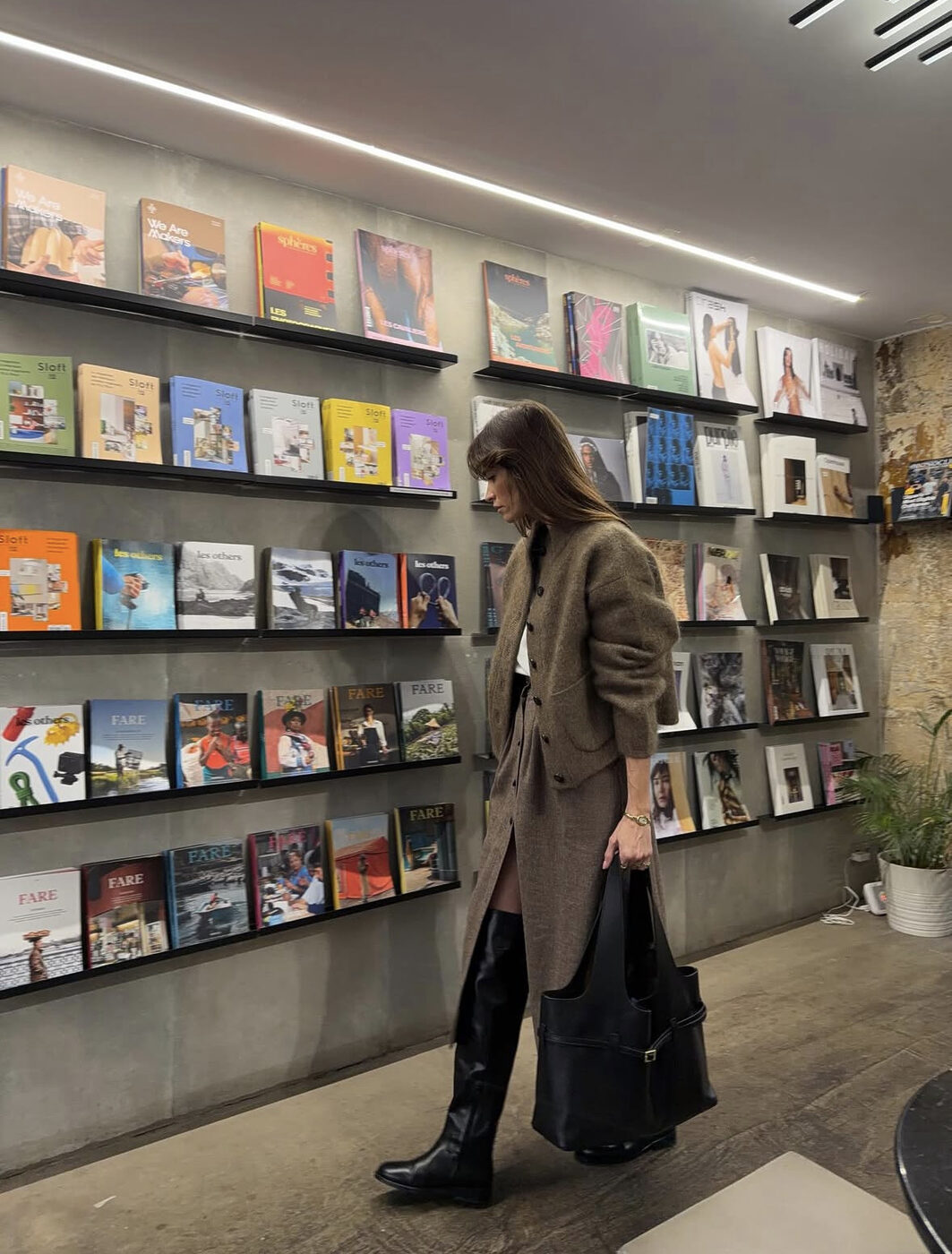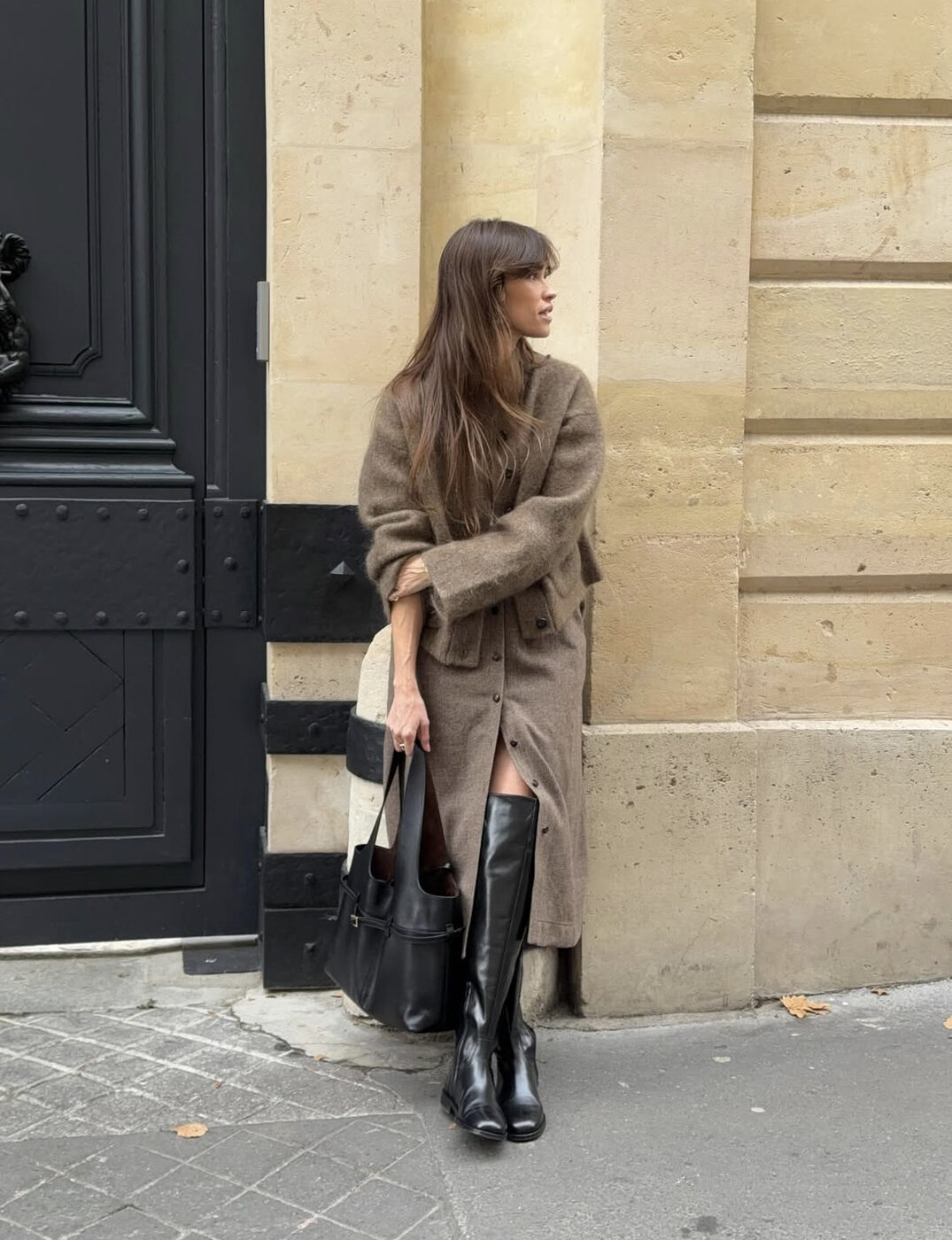 이 조합을 꼭 얌전하고 조신하게 입으란 법은 없습니다. 꽉 막힌 미디스커트가 아니라, 단추를 몇개 푸르거나 트임이 과감하게 있는 아이템을 선택해보는거죠. 롱부츠의 매끈한 라인이 보이면서 차분한 톤의 룩에 의외의 트렌디한 힘이 생깁니다. 추위에 반항하고 싶은 날, 이 정도의 틈만 줘도 룩이 세련되게 보일 거예요.