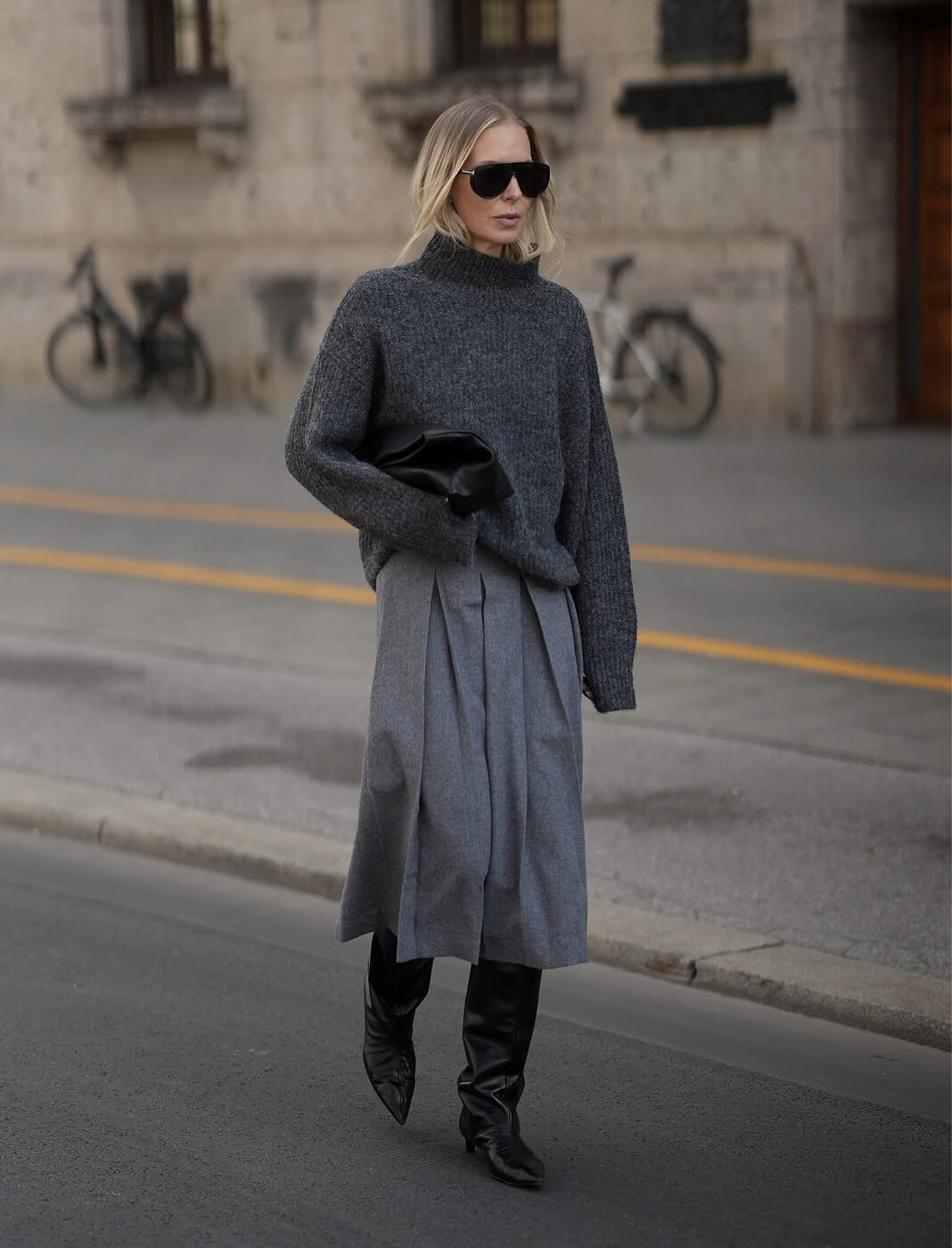 롱부츠와 미디스커트가 필승 조합인 이유는 단순한 무난함이 아닙니다. 둘을 함께 매치해주면 계절감과 우아함의 밸런스가 어느 정도 맞춰진다는 것이 가장 큰 장점이죠. 도톰한 니트, 롱부츠, 미디스커트 이 세 가지를 레이어드 하는 것만으로도 옷차림의 절반은 완성됩니다.