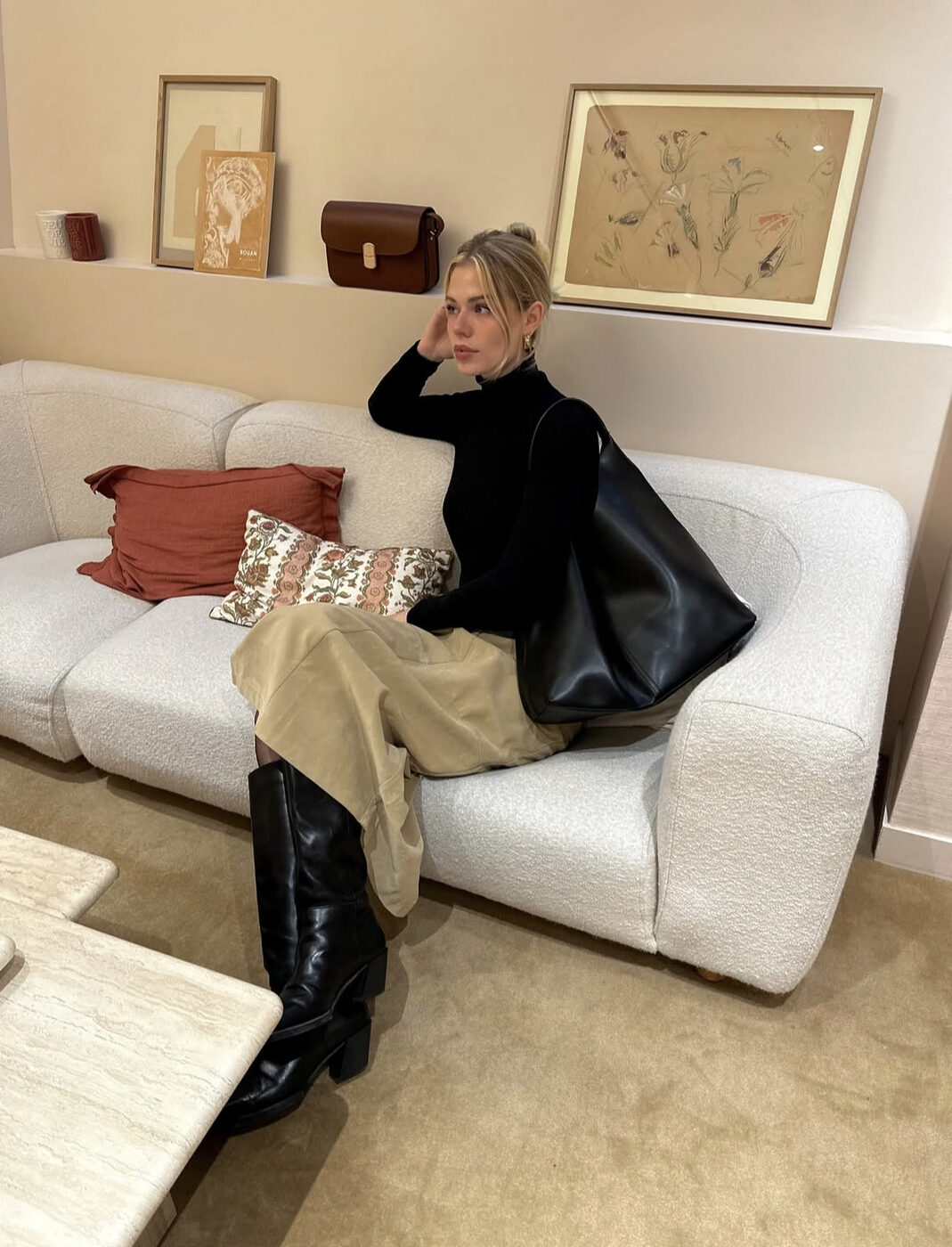 미디스커트가 유행이지만, 내가 원하는 비율로 보이지 않아서 입기를 망설였다면, 이 겨울철이 올해 마지막 기회입니다. 길이가 애매한 스커트는 부츠를 만나면 모든 문제가 싹 해결되니까요. 미디 길이가 가진 단정함은 더 극대화되니 실패할 여지가 없죠. 더 길어 보이는 비율을 갖고 싶다면, 키튼 힐이나 굽이 있는 부츠를 택하는 편이 좋겠습니다.
