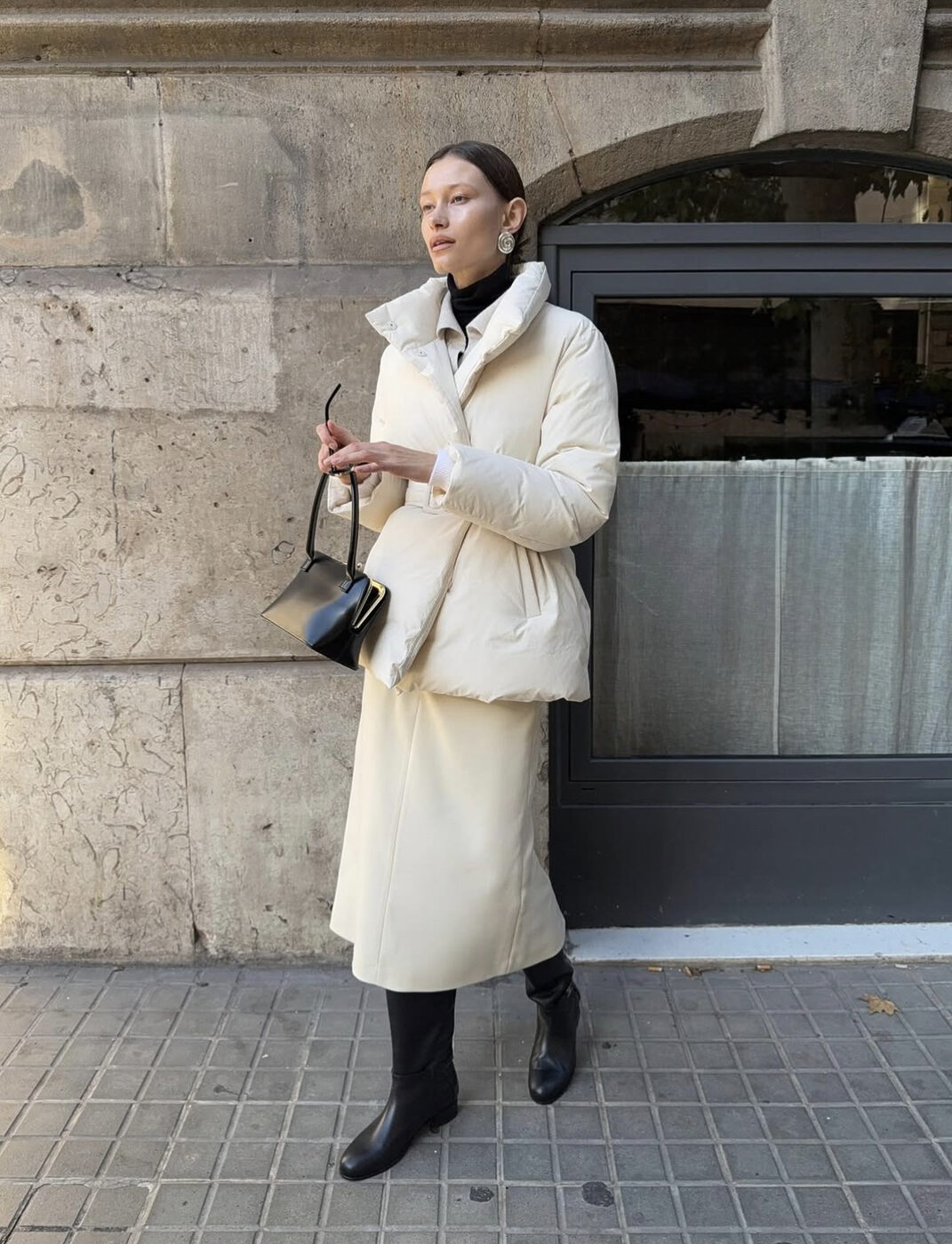 미디스커트는 바지처럼 다리 라인이 적나라하게 드러나지도 않고, 적당히 여유 있는 핏만 골라도 하루 종일 걱정이 없죠. 그러니까 짧은 패딩을 입어도 비율이 엉망 될 고민도 없고요. 여기에 롱부츠를 신으면 보온은 물론이고, 룩 전체가 단번에 단정해지는 효과가 배가됩니다. 특히 화이트 스커트는 칙칙해진 얼굴 톤까지 해사하게 보이게 해주니 어디에도 손색이 없죠. 깔끔하고, 우아하고, 따뜻한 조합이라 자부할 수 있습니다.