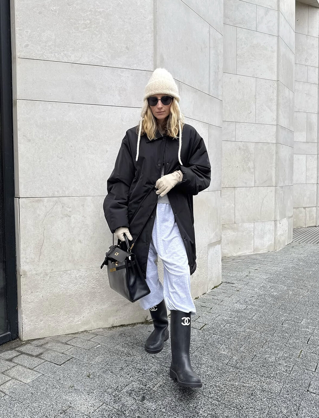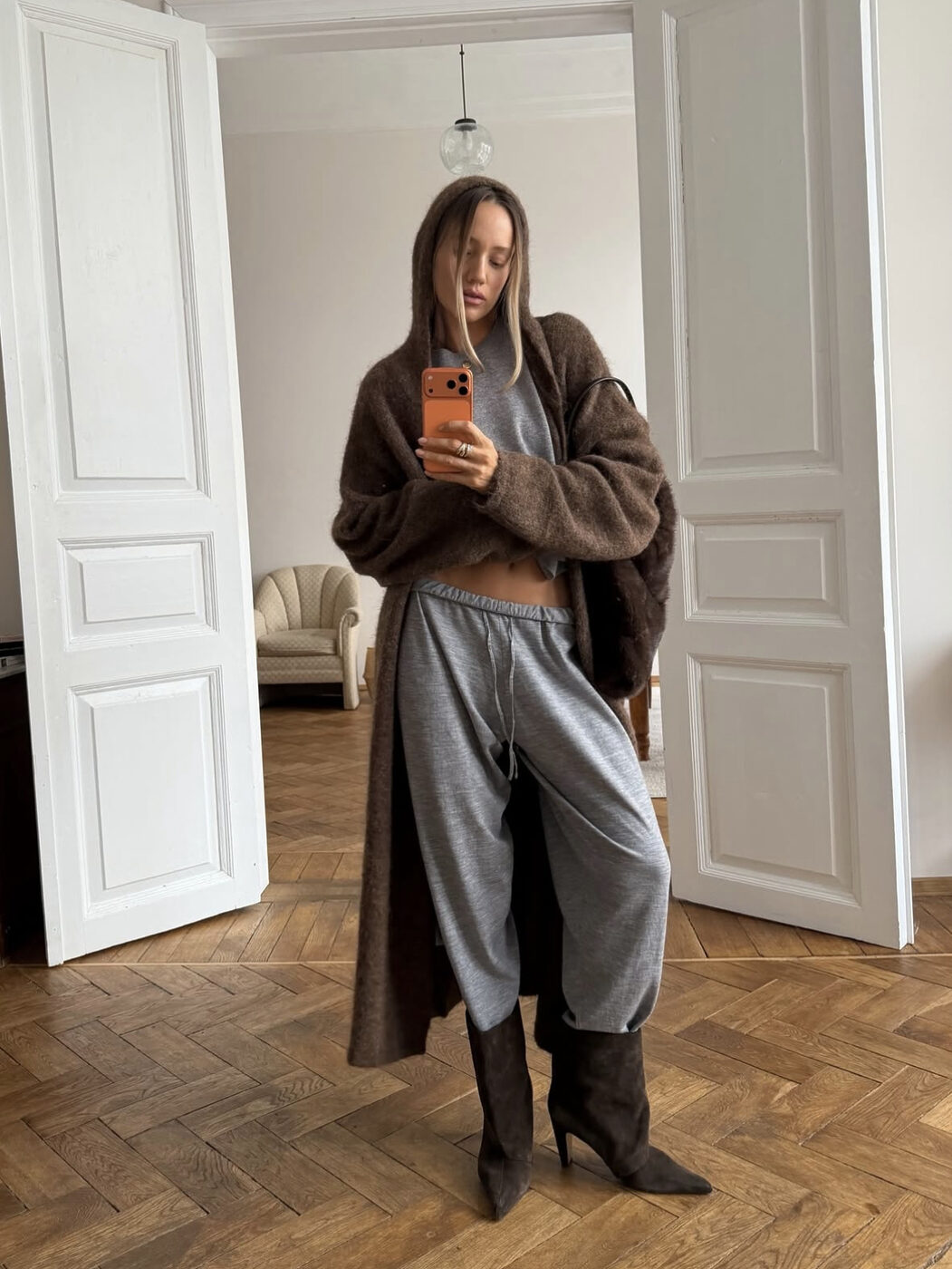 편하게 입은 그레이 조거 팬츠인데도 이리 멋있다니요. 여기에 성글고 긴 니트 소재의 코트를 걸치니까 쿨한 무드가 단번에 장착됩니다. 포인트는 바지 아래 신어준 통 큰 부츠. 팬츠 밑단을 부츠 안으로 넣어서 자칫 실내복처럼 보일 수 있는 실루엣을 잡아줬습니다. 조거 팬츠를 세련되게 입고 싶다면, 이렇게 상체는 슬림하게, 하체는 부츠로 캐주얼한 무드를 싹 정리해주는 것만 기억하면 되겠습니다.