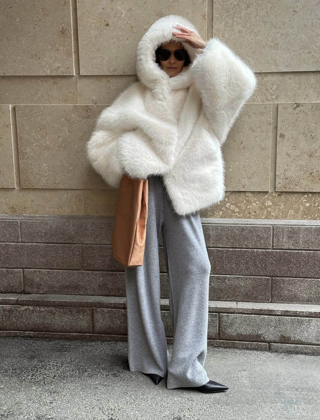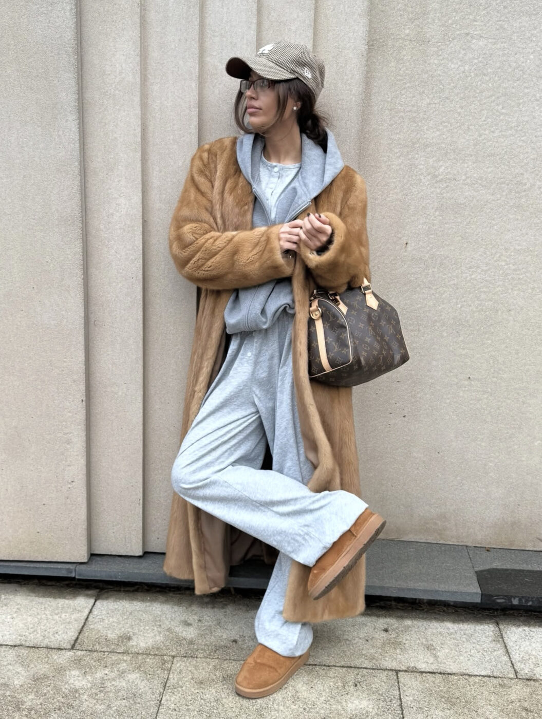스웨트 팬츠가 너무 가벼워 보일까 염려된다면, 이렇게 카멜 퍼 코트를 더해 단단하게 입어보세요. 회색 조거의 중립적인 톤이 퍼 코트의 웜한 컬러감을 중화시켜줍니다. 어그처럼 투박한 겨울 신발로 의외의 귀여움과 경쾌함을 주는 것도 훌륭하겠군요!