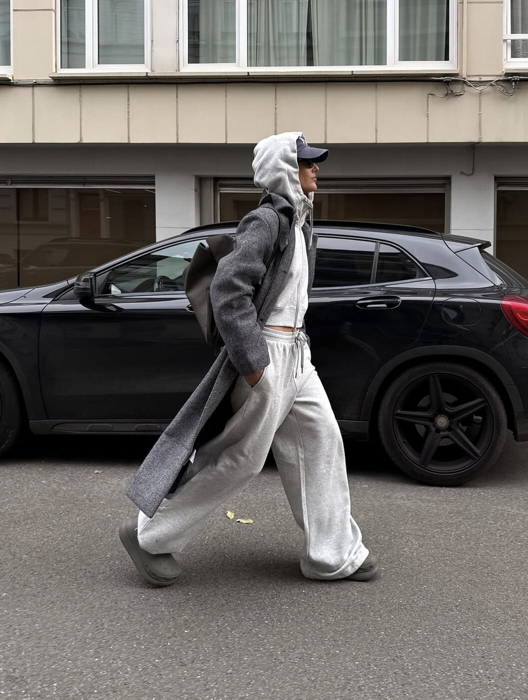 셋업으로 입으면 스웨트 팬츠의 장점이 더 분명해집니다. 색과 소재가 통일되니 느슨한 느낌보다 정돈된 맛이 탁 살아나니까요. 패션 인플루언서 한나처럼 아이보리 톤의 스웨트셔츠와 바지를 맞춰 입고, 아주 미니멀한 롱 코트를 걸치면, 놈코어 룩 저리 가라죠. 가방은 클래식한 걸로 들어준다면, 자연스럽게 멋있는 룩을 완성해 줄 겁니다.