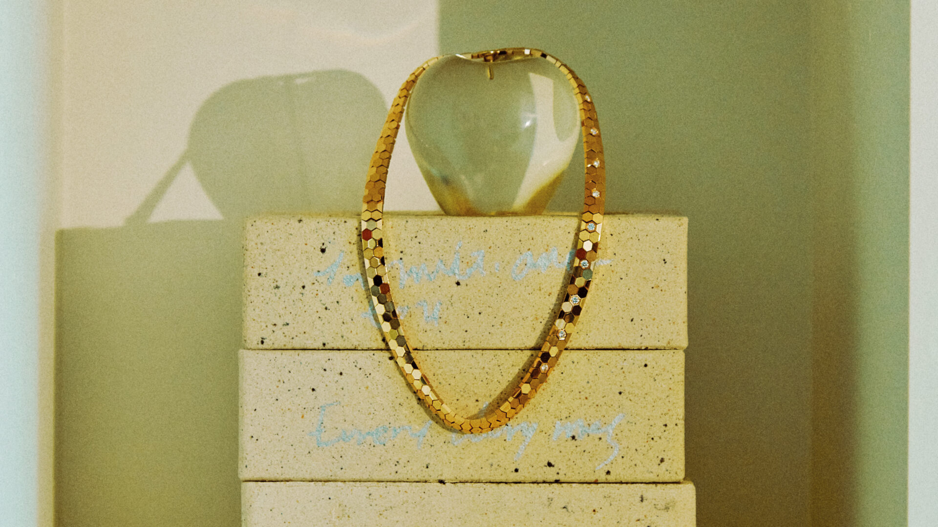 로즈 골드에 브릴리언트 컷 다이아몬드 9개(총 1.13캐럿)를 세팅한 비 드 쇼메 네크리스는 Chaumet 제품.
