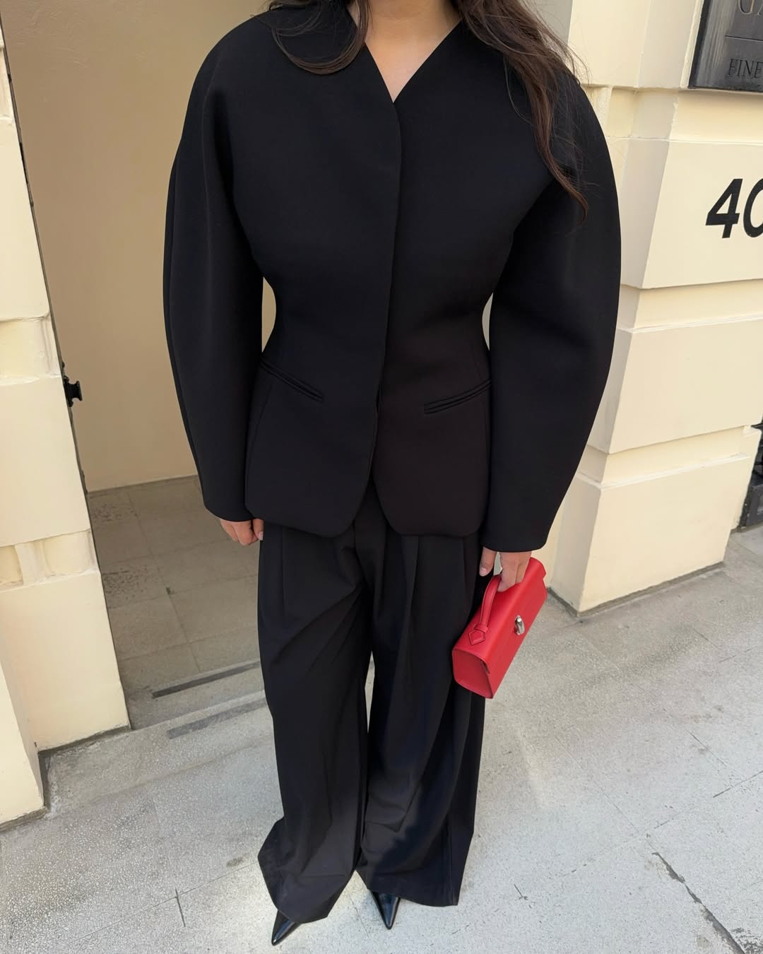 선뜻 레드 컬러에 도전할 용기가 안 날 땐 백이나 슈즈 같은 액세서리로 포인트를 줘 보세요. 드레시한 슈트에 작은 레드 토트백이면 충분합니다.