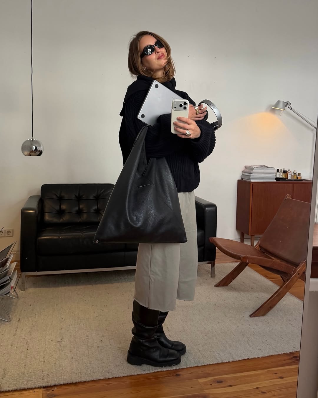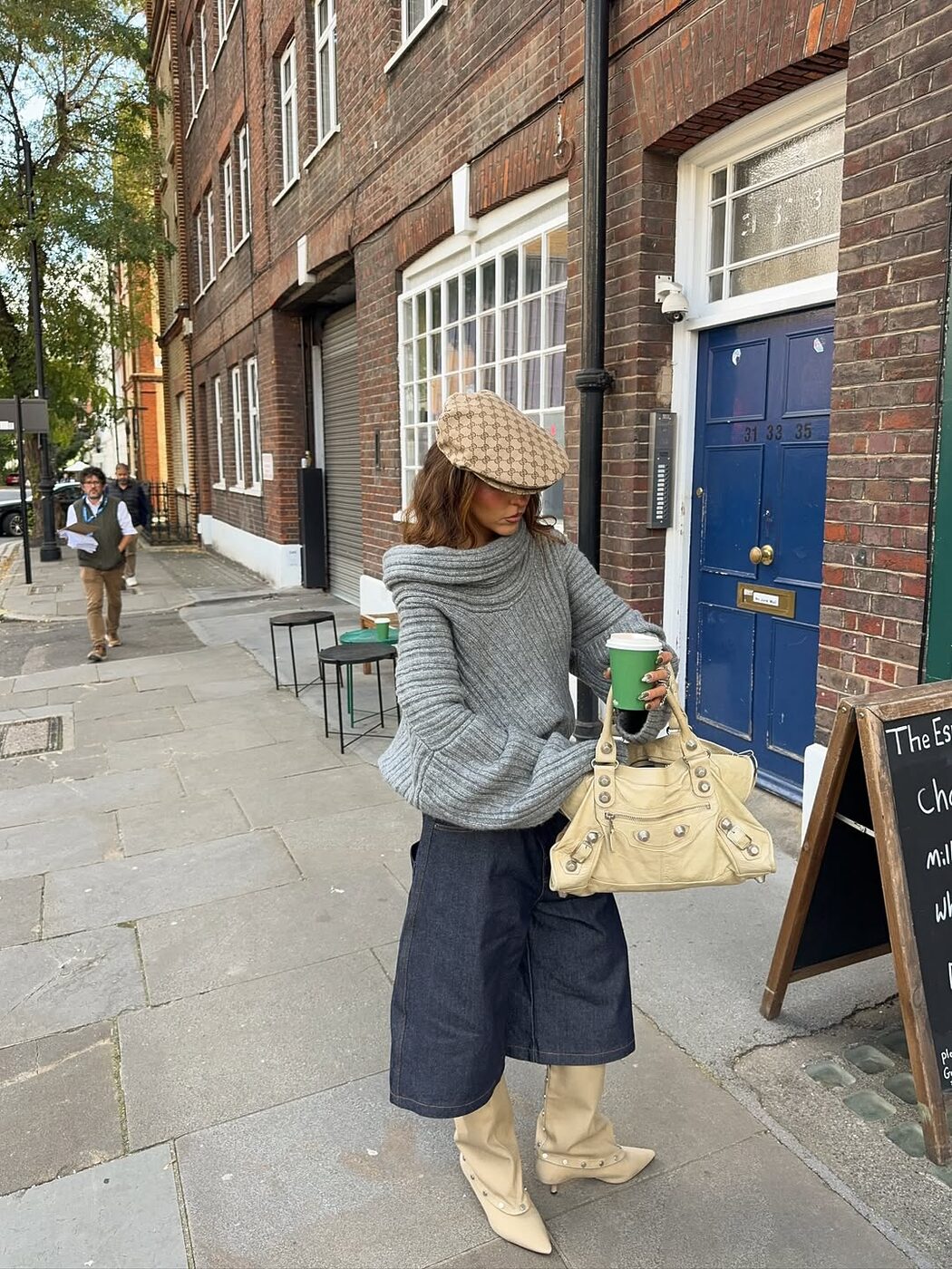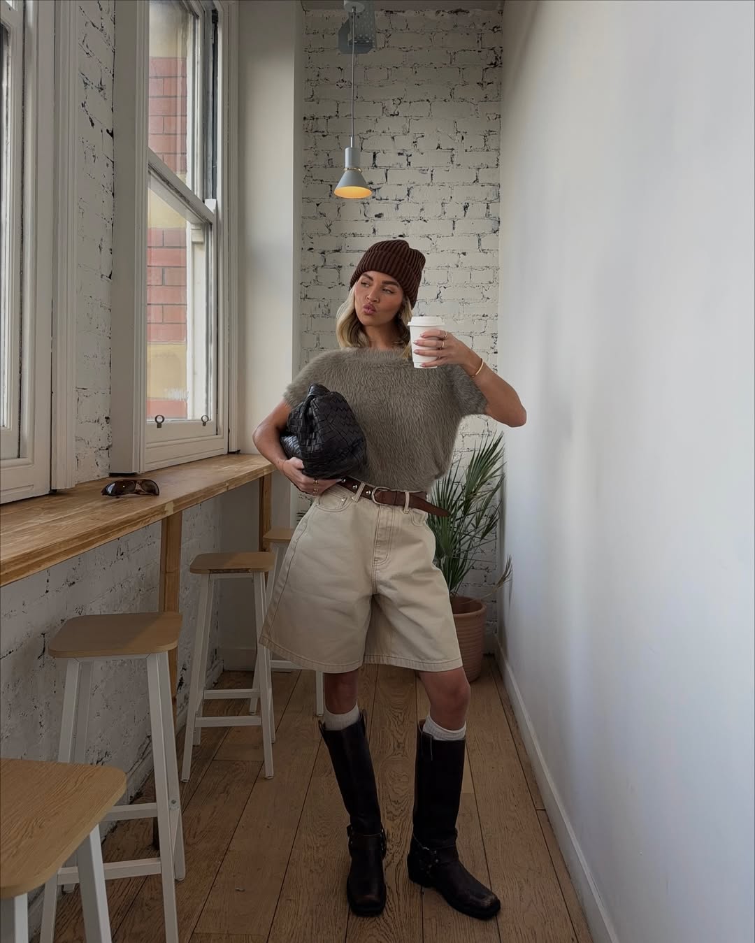 버뮤다 팬츠를 겨울에 가장 쉽게 소화하는 방법은 롱부츠와 매치하는 겁니다. 팬츠 기장이 무릎 아래로 떨어지기 때문에 롱부츠와 만났을 때 보온을 챙길 수 있어요. 그리고 바지와 부츠의 톤을 맞춰주면 팬츠 밑단에서 부츠로 이어지는 라인이 자연스럽게 연결되면서 다리가 훨씬 길어 보이는 효과까지 챙길 수 있죠.