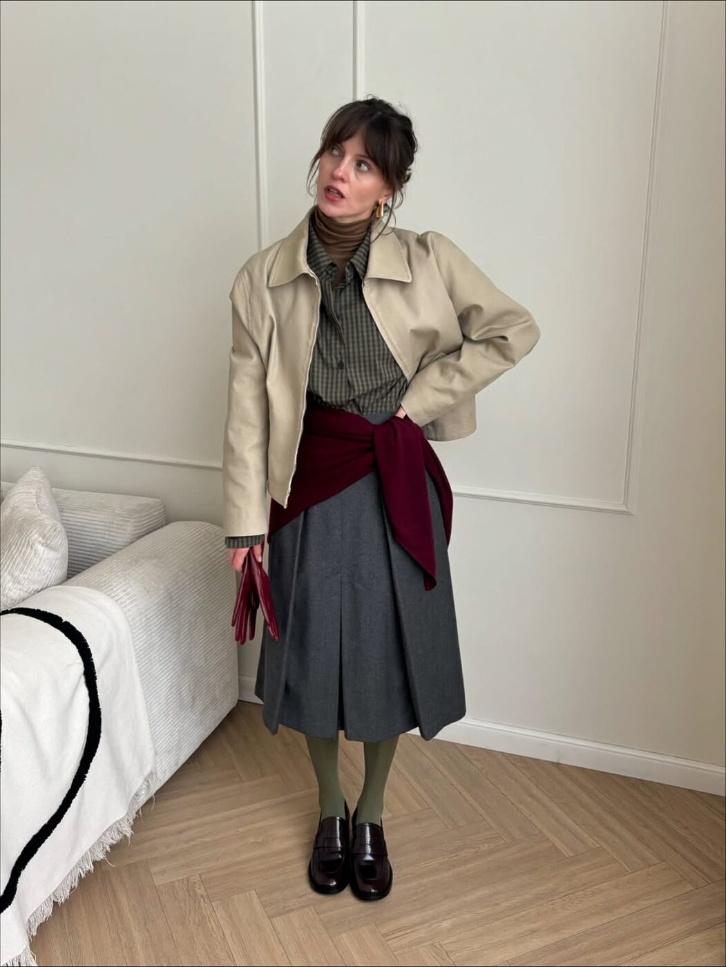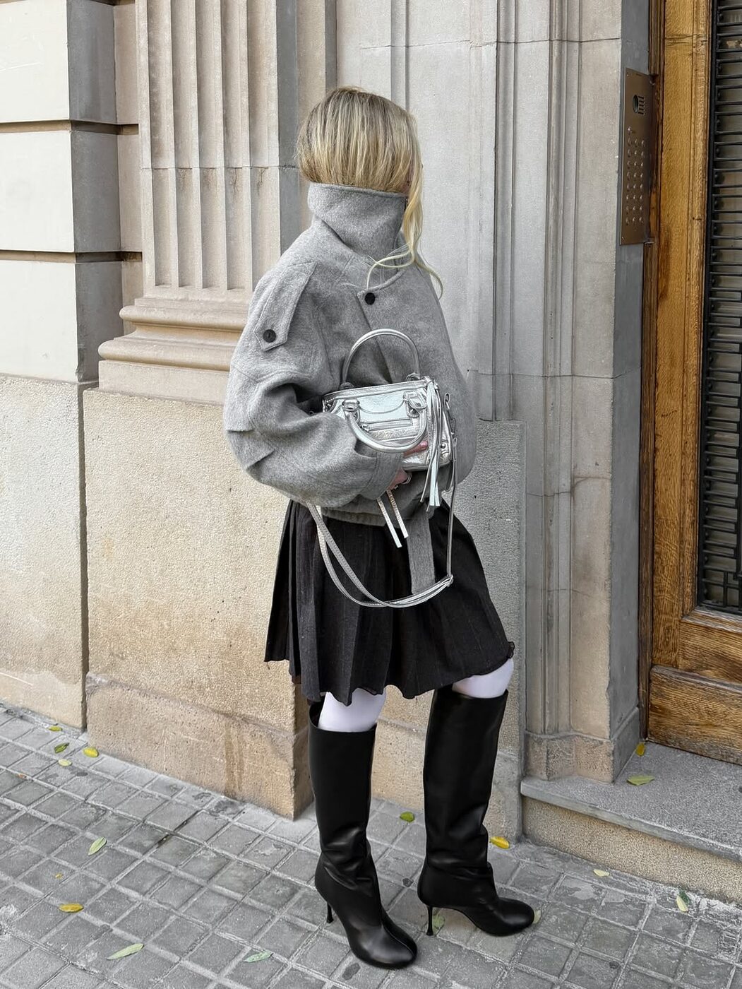 겨울 아우터는 대부분 소재가 두껍고 시각적으로 부피가커지기 쉽습니다. 그레이 컬러의 하의는 이 묵직함을 적절히 중화하면서 균형을 잡아주는 역할을 하죠. 미디 길이의 플리츠 스커트에는 짧은 숏 코트나 재킷이 특히 잘 어울립니다. 상의 길이를 과감하게 줄여주면 허리선 위치가 높아 보이고 비율도 깔끔하게 정리되죠.