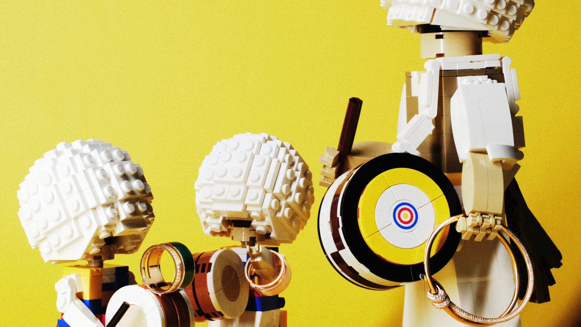 왼쪽부터 | 핑크 골드에 그린 래커와 다이아몬드를 세팅한 베르베르 크로마틱 두바이 에디션 래커 링, 핑크 골드에 누드 래커와 다이아몬드를 세팅한 베르베르 크로마틱 누드 래커 링은 Repossi 제품. 로즈 골드에 다이아몬드를 세팅한 티파니 노트 더블 로우 다이아몬드 링, 로즈 골드에 다이아몬드를 세팅한 티파니 노트 더블 로우 다이아몬드 힌지드 뱅글은 Tiffany & Co. 제품. / 콜린 진(Colin Jin), ‘금회북춤(200%ver)’, 125×125×270㎜ 콜린 진, ‘금회북춤(작은 무원)’, 60×70×135㎜