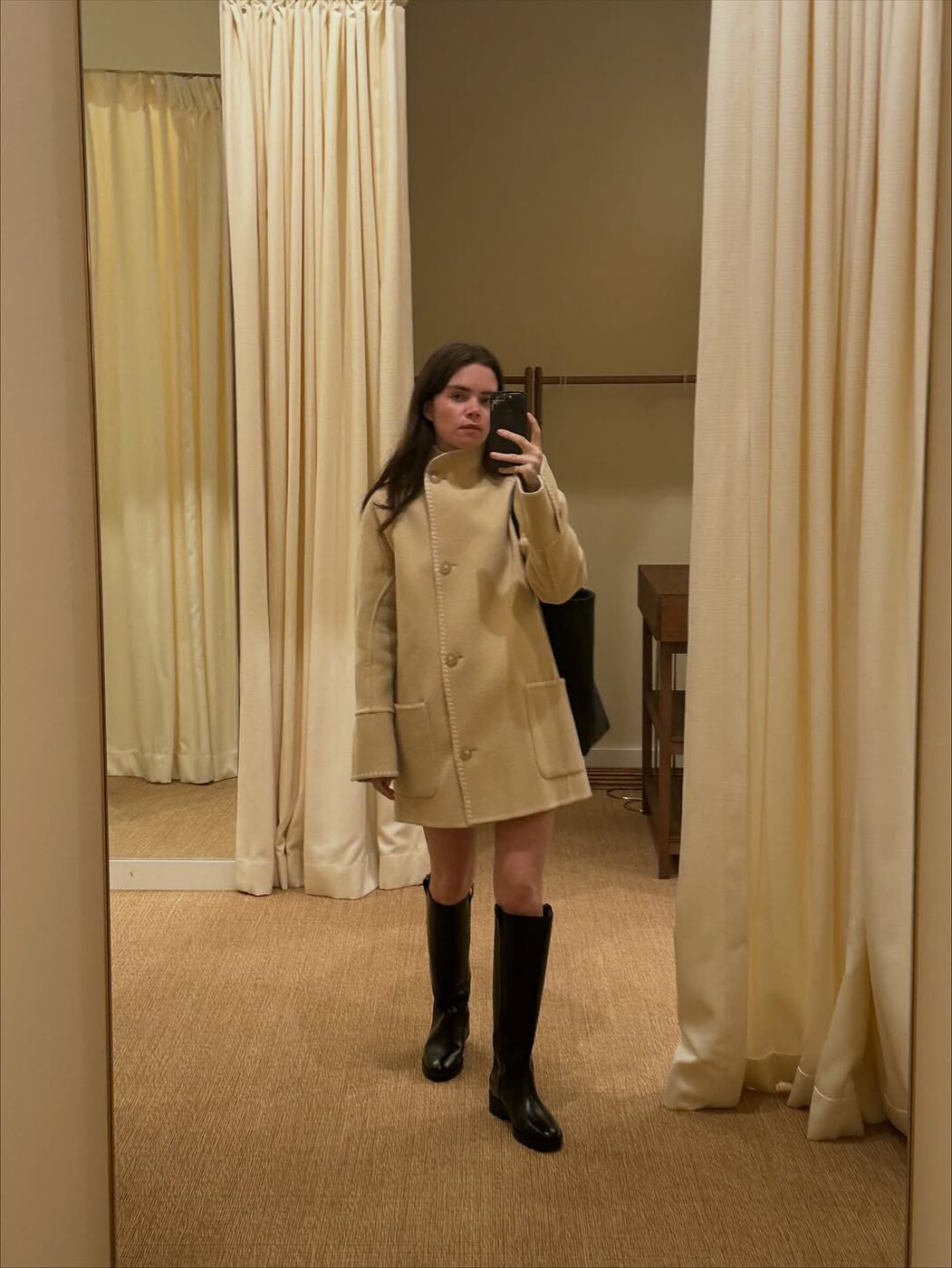 코트를 원피스처럼 연출하고 롱부츠를 함께 매치해 소녀스러운 룩을 완성했죠. 이 스타일링에서도 단연코 빛난 건 목이 살짝 올라오는 하이넥 라인의 코트입니다. 단정함과 우아함을 동시에 지닌 이 넥 라인이 분위기를 한층 더 세련되게 만들어줬네요!