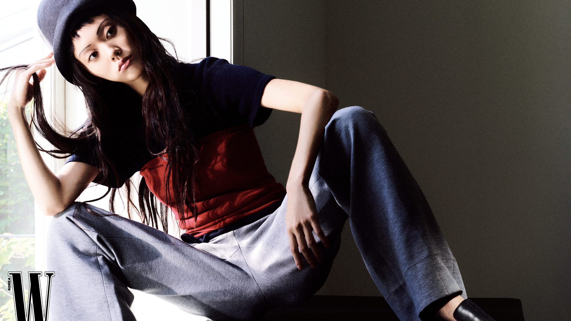 니트 스웨터는 3백20만원, 빨강 니트 톱은 가격 미정, 팬츠는 2백80만원, 브림이 동그란 모자는 89만원, 로퍼는 1백76만으로 모두 미우미우 제품.
